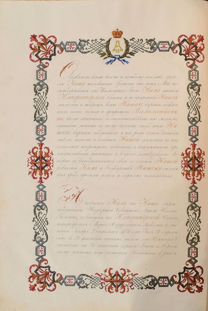 Gorgeous vellum manuscript DS, in Cyrillic, seven pages on four sheets, 12.75 x 18, no date. Remarkable hand-illuminated document by which Emperor Alexander II of Russia grants Adam Ilyin Galonen a coat of arms. The document describes Galonen's career as a medical officer in the Russian Navy, in which he earned numerous accolades including "the Highest Grace for the participation in Helsingfors batteries defence during the British and French bombardment of Sveaborg fortress." The document features a gorgeous painting of a heraldic crest which depicts "a silver three-masted battleship on a blue shield…crowned with a noble helmet and crown," and grants Galonen permission to "use, in accordance with his will and desire, the described above Coat of Arms in all decent and appropriate cases, letters, seals, on houses and domestic tools and wherever his honour and other circumstances require." Prominently signed at the conclusion by Alexander II. The document is contained in a large green velvet 13 x 18.5 presentation folder. Wear and damage to the covers of the presentation folder, but the handsome document itself is in clean, fine condition. Accompanied by a complete English translation. An absolutely stunning document, featuring marvelous hand-decorated ornate borders in addition to the large, detailed painting of the coat of arms.