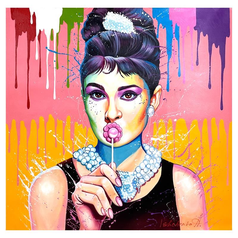 "Audrey Hepburn" is an original acrylic painting on canvas by Alexander Ishchenko, hand signed by the artist. Includes Letter of Authenticity. Measures approx. 36" x 36" (image).