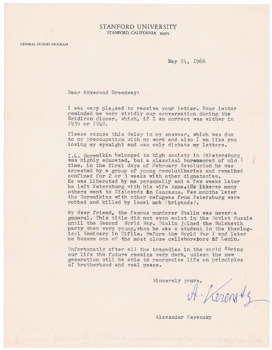 TLS signed “A. Kerensky,” one page, 8.5 x 11, Stanford University letterhead, May 24, 1966. Letter to Reverend Cornelius Greenway. In part: “I. L. Goremikin belonged to high society in St. Petersburg, was highly educated, but a classical bureaucrat of old time. In first days of February Revoluyion [sic] he was arrested by a group of young revolutionaries and remained confined for 2 or 3 weeks with other dignitaries. He was liberated by me personally and a few weeks later he left Petersburg with his wife Anna. He like others went to Kislovods in Caucasus. Few months later the Goremikins with other refugees from Petersburg were robbed and killed by local mob (brigands). My dear friend, the famous murderer Stalin was never a general. This title did not even exist in the Soviet Russia until the Second World War. Stalin joined the Bolshevik party when very young, when he was a student in the theological seminary in Tiflis. Before the World War I and later he became one of the most close callaborators [sic] of Lenin. Unfortunately after all the tragedies in the world during our life the future remains very dark, unless the new generation will be able to reorganize life on principles of brotherhood and real peace.” In fine condition. Kerensky was the provisional leader of the Soviet Union from July to November 1917, when he was unseated by Lenin and forced into exile in the October Revolution. Excellent content concerning the Russian Revolution.