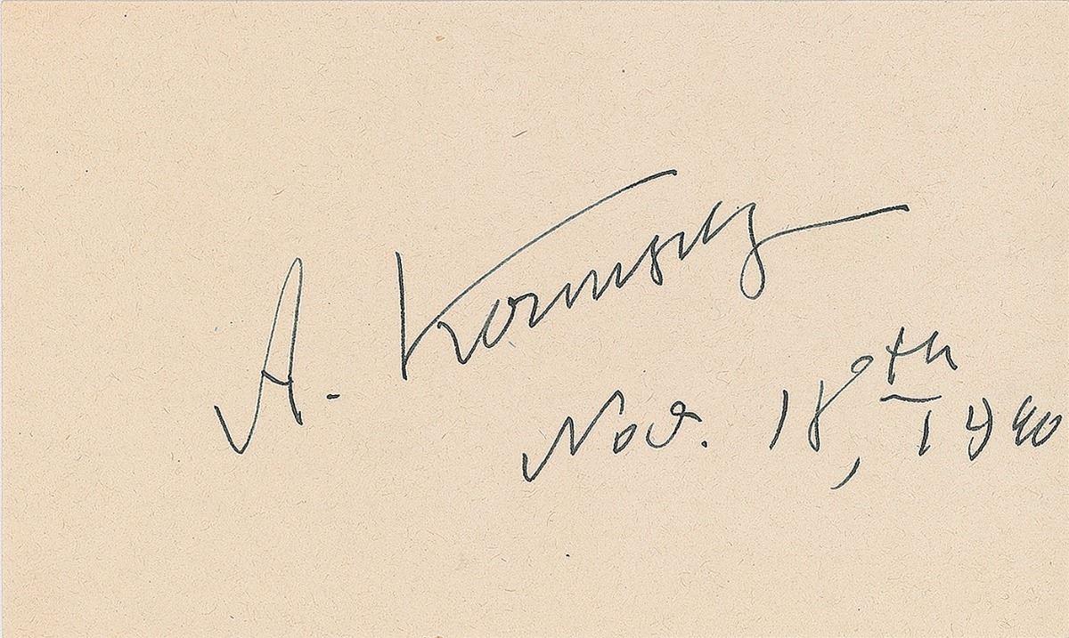 Provisional leader of the Soviet Union (1881–1970) from July to November 1917, when he was unseated by Lenin and forced into exile. Ink signature, “A. Kerensky, Nov. 18th, 1940,” on an off-white 5 x 3 card. In fine condition.