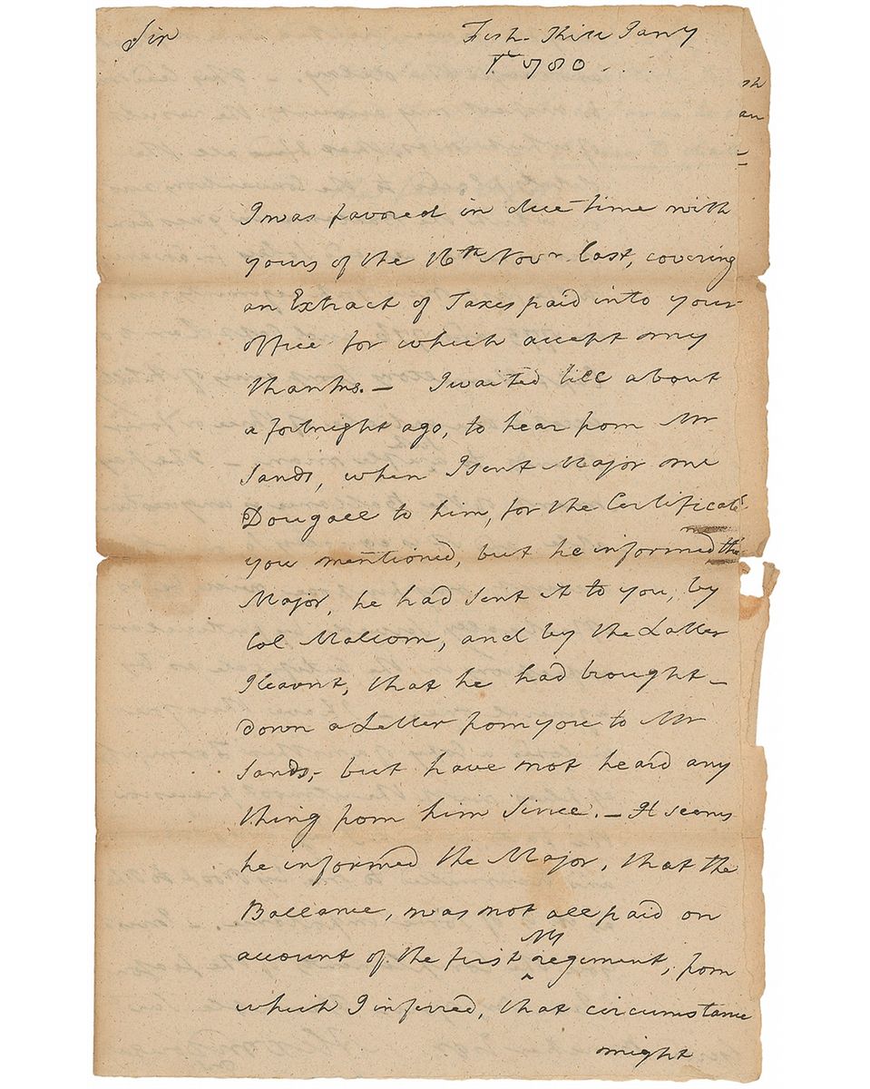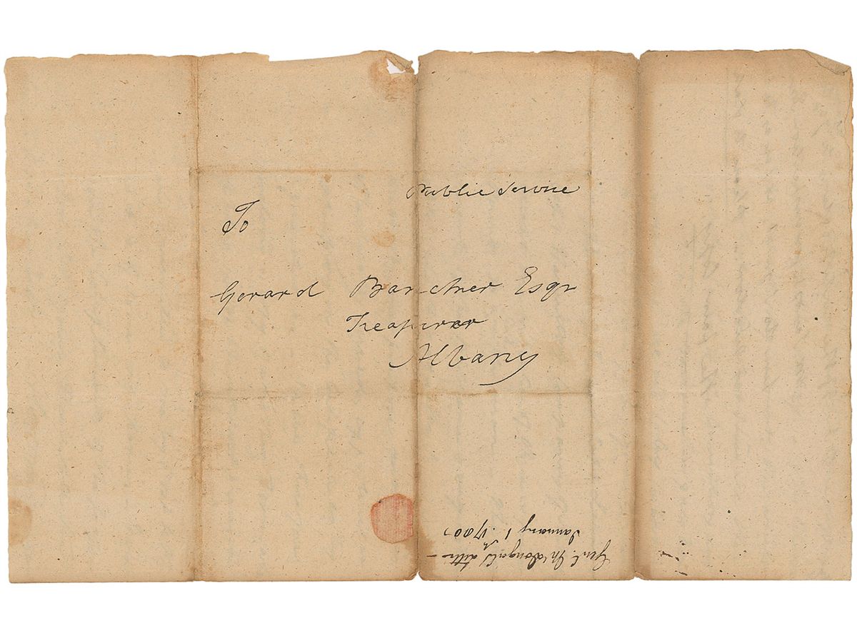 Served as a major general in the Continental Army, and as a delegate to the Continental Congress. After the war, he was the president of the first bank in the state of New York and served a term in the New York State Senate. Revolutionary War-dated ALS, three pages on two adjoining sheets, 8.25 x 13.25, January 1, 1780. Letter to Gerard Banchner. In part: “I waited till about a fortnight ago, to hear from Mr. Sands when I sent Major McDougall to him for the certificate you mentioned, but he informed the major he had sent it to you…It seems he informed the Major that the balance was not all paid on account of the first NY regiment, from which I inferred, that circumstances might have created some difficulty…This led me to inspect my account, the result of which was, that all the debits placed to the Convention amount on which the balance in question…were all and solely for advances to the first New York regiments raised in 1775 and 1776, and Capt Lamb & Capt. Hamilton’s companies of artillery except one article of three or four pounds to a sick rifleman.” Reverse of the second page bears an address panel in McDougall’s hand. Toning along folds and edges, a few small separations and areas of paper loss to spine, and a rough right edge, otherwise fine condition. In June of 1775, four New York infantry regiments were authorized by the New York Provincial Congress, with McDougall given command of the 1st NY Regiment; reconfigured the following year, the 1st NY was charged with manning the fortifications of New York City.