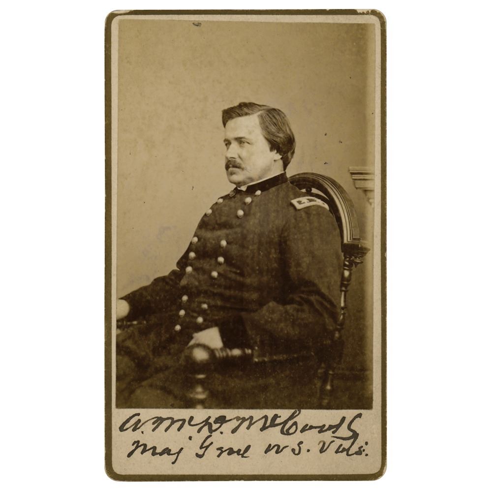 Union general (1831–1903) who was court-martialed and partially blamed for the Union disaster at Chickamauga. Desirable twice-signed 2.5 x 4 carte-de-visite photo of McCook in uniform, signed on the mount in ink, "A. McD. McCook, Maj. Genl. US Vols," and also signed on the reverse, "A. McD. McCook, Col: 6 NY, Bvt. Maj. Genl., U.S. Army." In fine condition.