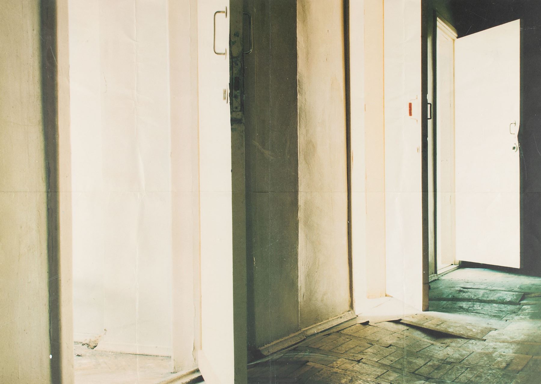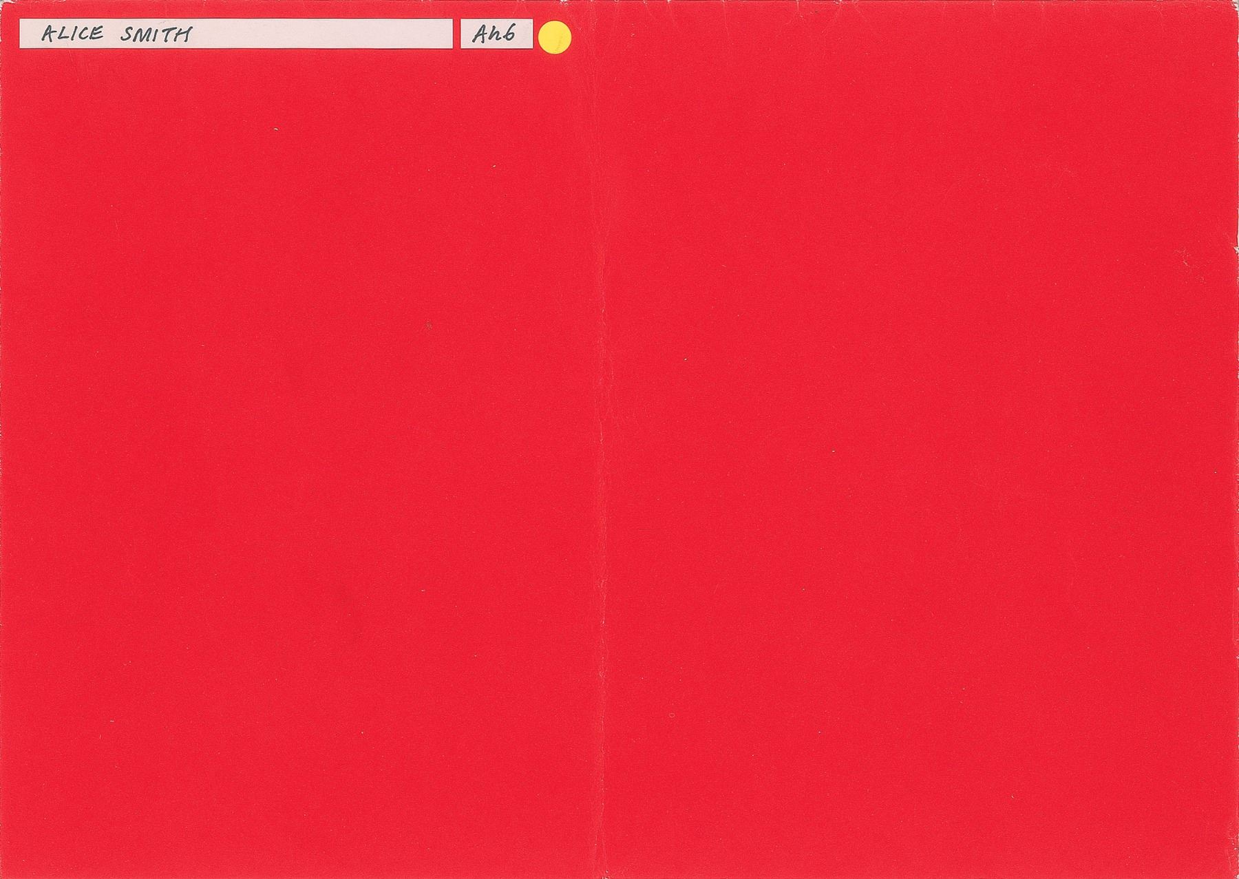 Invitation for Alexander McQueen's celebrated fashion show, ‘Voss,’ presented at London's Gatliff Road Warehouse on September 26, 2000, as part of the designer’s Spring/Summer 2001 collection. The invitation, with a red center panel measuring 11.75˝ x 8.25˝, unfolds into a 23.25˝ x 16.5˝ poster that depicts the inner hall of a sanitarium, with open doors to three sun-splashed rooms; the center panel simply lists in white text the event, venue, press, and buyer information. On the opposite side, the invitation is issued to “Alice Smith” for seat “An6,” and features an affixed yellow sticker. In fine condition, with expected folds and some light creasing.