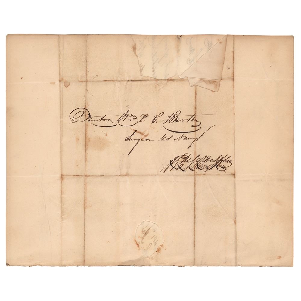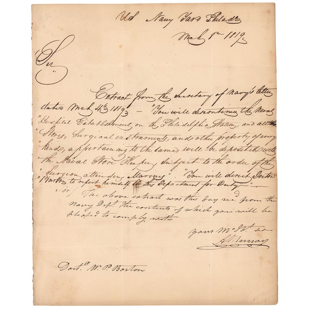 Naval officer (1755–1821) who served in the Continental Navy, the Continental Army, and the United States Navy, during the American Revolutionary War, the Quasi-War with France, and the First Barbary War in North Africa. ALS signed “A. Murray,†one page, 8 x 10, March 8, 1819. Letter to naval surgeon William P. C. Barton, in part: "Extract from the Secretary of the Navy's letter dated Mch. 4th 1819—'You will discontinue the Naval Hospital Establishment on the Philadelphia Station, and all Stores, Surgical instruments, and other property of every kind, appertaining to the same, will be deposited with the Naval Store Keeper, subject to the order of the Surgeon attending Marines.'" Below, Murray writes: "The above extract was this day rec'd from the Navy Dept. the contents of which you will be pleased to comply with." In fine condition.
