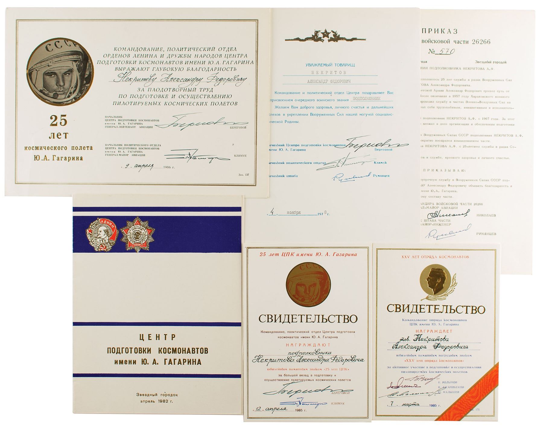 Group of six cosmonaut-signed documents from the estate of Lieutenant-Colonel Alexander Nekritov, who served in Air Force Regiment #26266 during the 1970s–80s, attached to the Yuri Gagarin Cosmonaut Training Center in Star City. Includes: 1986 award certificate commemorating the 25th anniversary of Gagarin's flight, signed by Georgy Beregovoy and Pyotr Klimuk; 1978 document congratulating him on the promotion to lieutenant-colonel, signed by Georgy Beregovoy and Pyotr Klimuk; 1979 Order #570 of Regiment #26266 of Star City, signed by Andriyan Nikolayev; 1982 Yuri Gagarin Cosmonaut Training Center certificate expressing thanks for work carried out in the Intercosmos program, signed by Georgy Beregovoy and Pyotr Klimuk; 1985 award citation for a 25th anniversary of the cosmonaut regiment badge, signed by Boris Volynov, Vladimir Dzhanibekov, and Yuri Malyshev; and a 1985 award citation for a 25th anniversary of the Cosmonaut Training Center badge, signed by Georgy Beregovoy and Pyotr Klimuk. In overall fine condition. An uncommon grouping of noteworthy certificates.