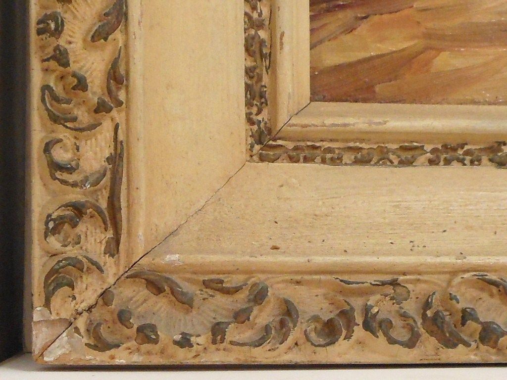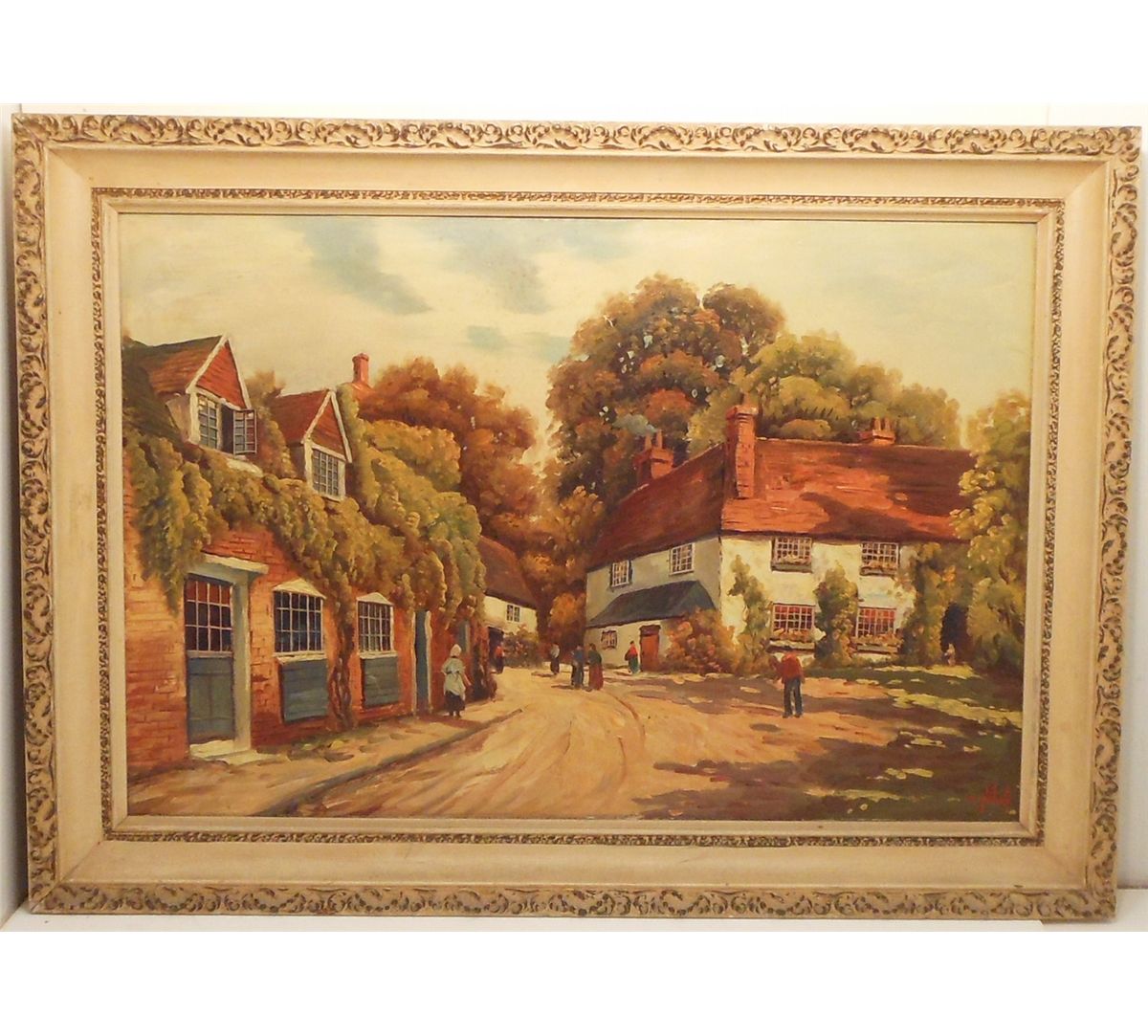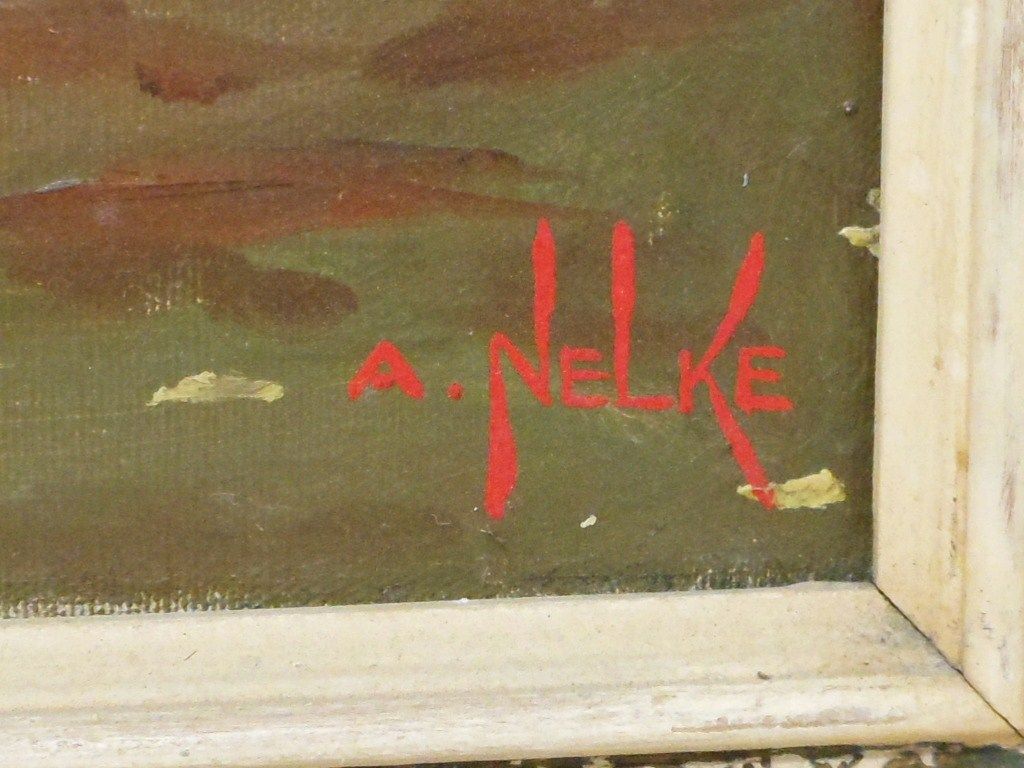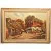 35 1/2" X 23 3/4" in a 42 3/4" X 30 1/2" Frame. Alexander Nelke (1984-1974) New York Artist. Oil On Canvas of a Village scene. Signed in the lower right corner. Great Condition with some cracklature, a small indentation, and some discoloration/staining. (See Pictures) Frame is in Good Condition with some paint loss and areas of wear/small cracks to the wood.