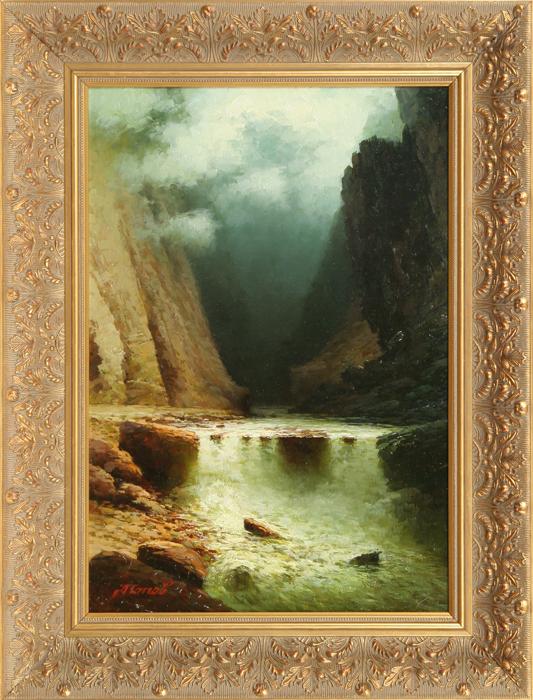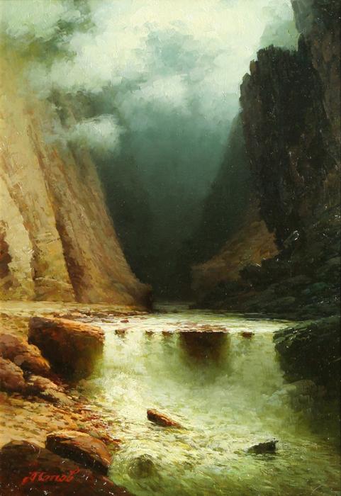 Alexander Nicholayevich Popoff (b. 1959). Wandering Waters. 19 1/2" x 13 1/2" oil on canvas. signed lower left. Condition Report: Black lights clean.