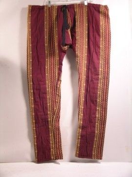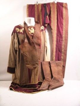 From the 2004 action-adventure 'Alexander,' directed by Oliver Stone and starring Colin Farrell and Anthony Hopkins, this is a complete Persian soldier costume. The wardrobe is comprised of a pair of thick red cloth pants, covered with gold stitching embroidery, with a black drawstring; a large size, long sleeve top with gold and red stitching and embroidery, featuring three Lion symbols at the neckline; a pair of calf-high leather boots with leather tie strings, and a leather 'cap' with long tie straps.