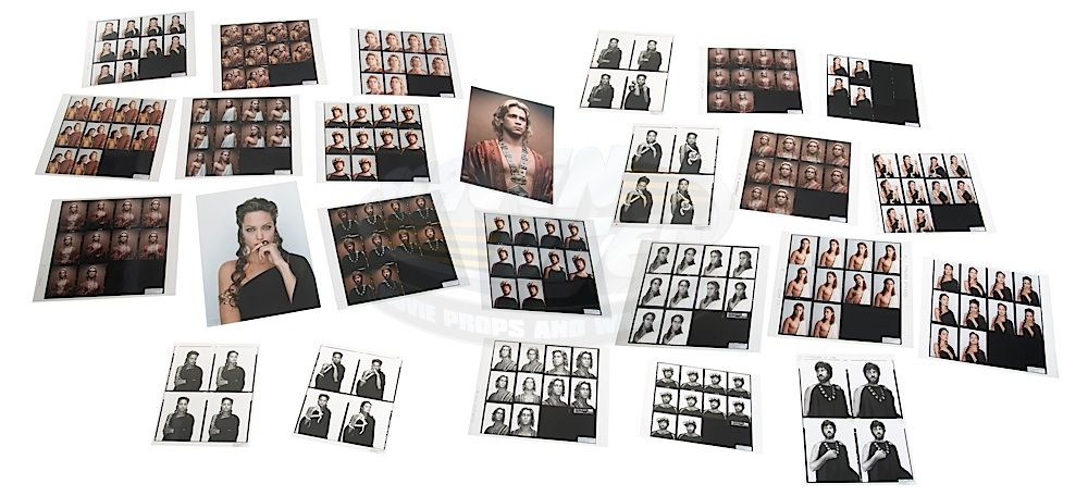(Warner Bros., 2004) This lot consists of 23 pages of original production contact sheets and 2 color photographs, each page measuring 11" x 14". The images feature Angelina Jolie (Olympias), Colin Farrell (Alexander), Val Kilmer (Philip), Jared Leto (Hephaistion) and Rosario Dawson (Roxane) in a special photo shoot for the film's advertising campaign. The images are unique with some if not all being unpublished, making this a very rare collection of images from the film.