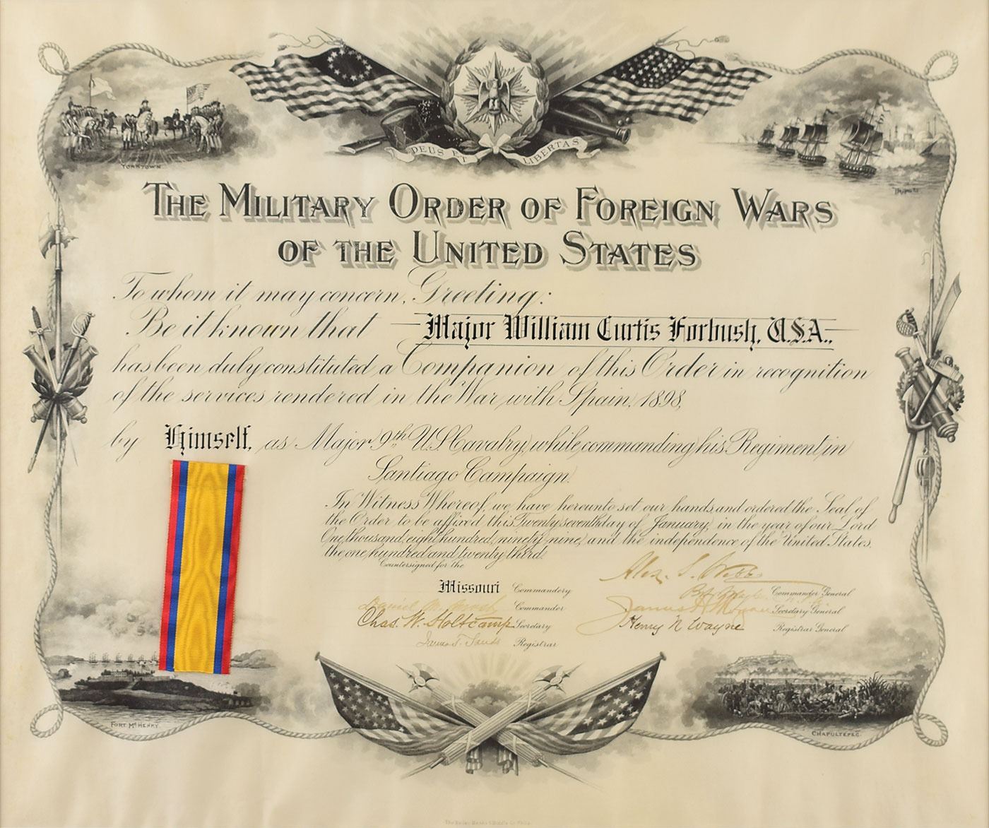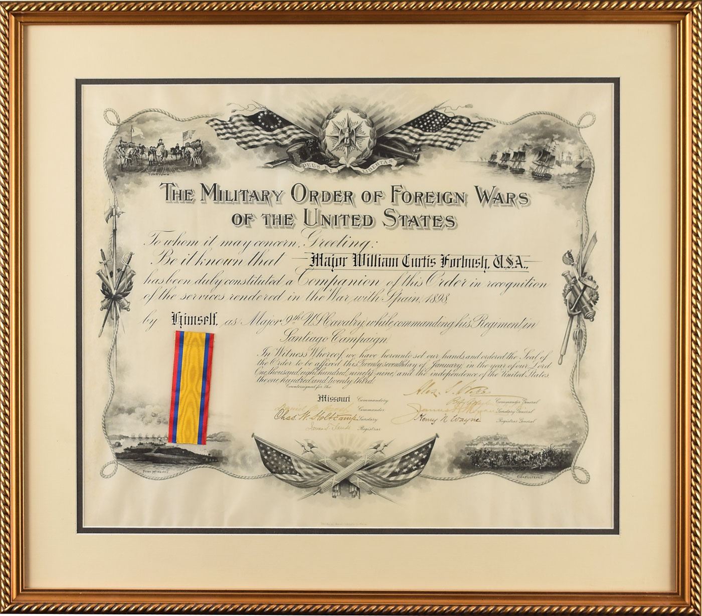 Union general and Medal of Honor recipient (1835–1911). During the Antietam campaign, Webb was chief of staff of General Fitz John Porter's 5th Corps. Just prior to the battle of Gettysburg, he was promoted to brigadier general, and took command of the 2nd Brigade, Gibbon's Division, of Hancock's 2nd Corps. Partly-printed vellum DS, signed “Alex. S. Webb,” one page, 18.5 x 15.25, January 27, 1899. Certificate for the "Military Order of Foreign Wars of the United States" awarded to Major William Curtis Furbush for "the services rendered in the War with Spain, 1898, by himself, as Major 9th U.S. Cavalry, while commanding his Regiment in Santiago Campaign." Signed at the conclusion by Alexander S. Webb, and countersigned by five others. The yellow, blue, and red ribbon affixed to the lower left is intact. Attractively double-matted and framed to an overall size of 24.5 x 21.5. In fine condition.