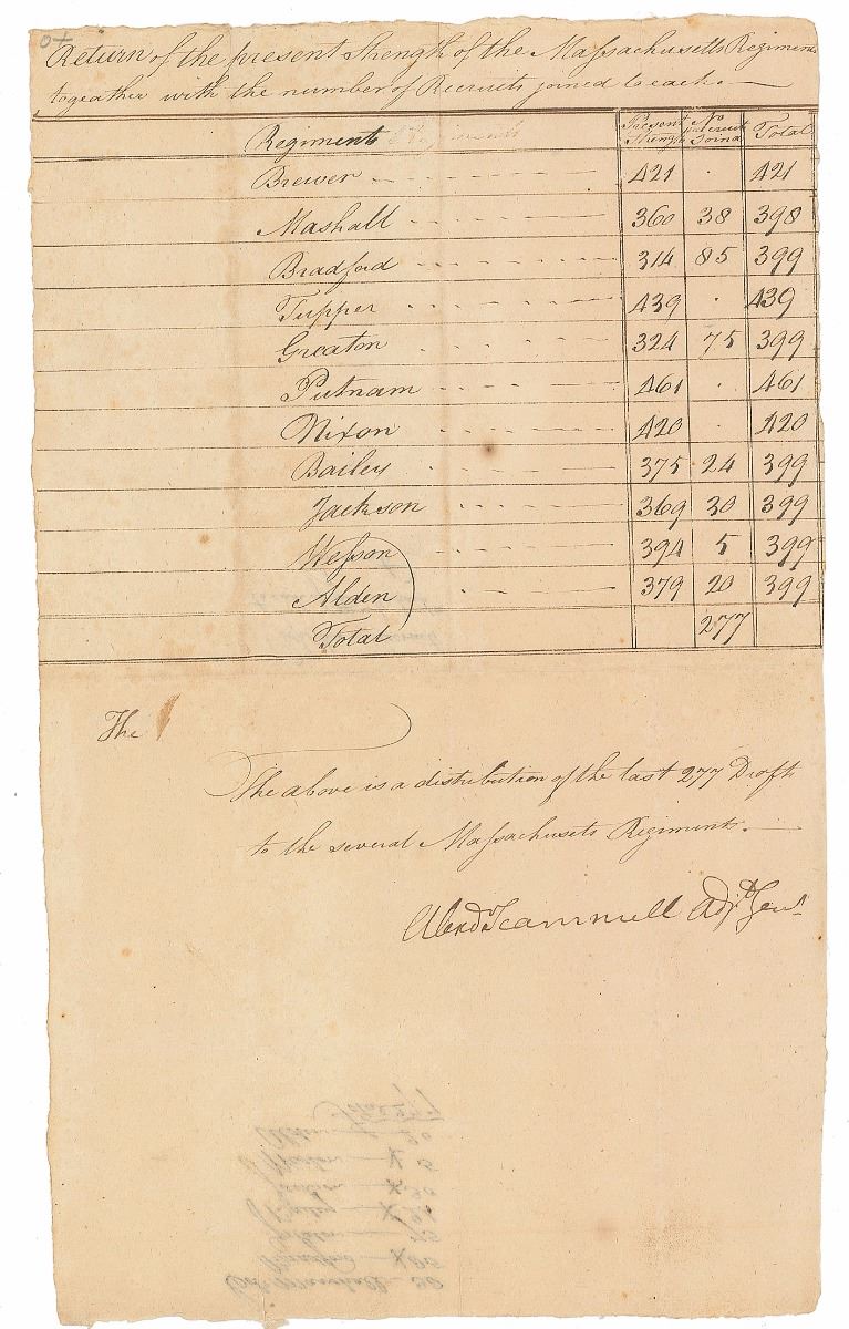 Officer in the Continental Army and member of George Washington's inner circle who was the highest ranking American officer killed during the Siege of Yorktown (1747–1781). Uncommon Revolutionary War–era manuscript DS, signed “Alexdr. Scammell, Adjt. Genl.,” one page, 8 x 13.5, no date by circa 1776–1777. Document headed “Return of the present Strength of the Massachusetts Regiments together with the number of Recruits joined to each.” The document lists the troop strength of eleven Massachusetts regiments, identifying each commander: “Brewer,” “Marshall,” “Bradford,” “Tupper,” “Greaton,” “Putnam,” “Nixon,” “Bailey,” “Jackson,” “Wesson,” and “Alden.” Signed at the conclusion by Scammell to confirm the distribution of new recruits amongst the regiments. Intersecting folds, light soiling, and slight show-through from docketing to reverse, otherwise fine condition.