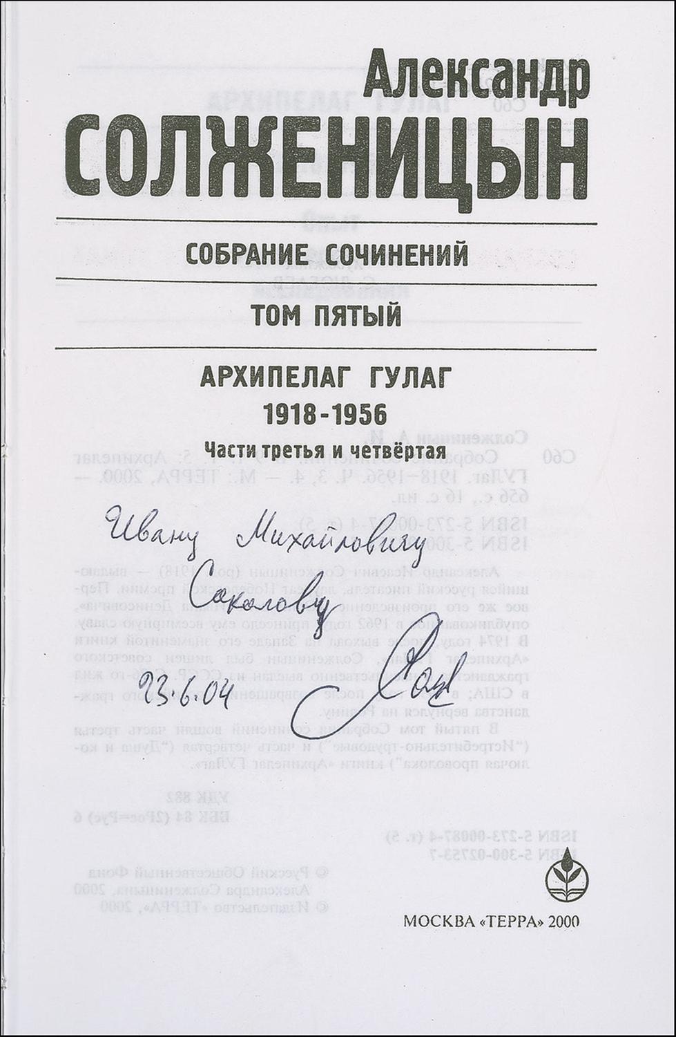 Nobel Laureate in Literature, 1970. Signed book: Gulag Archipelago (Russian edition). Later printing. Moscow: Maskwá Terra, 2000. Hardcover, 5.25 x 8.25, 656 pages. Signed and inscribed on the title page, in Russian, (translated): “Ivan Mikhailovich Sokolov. Alexander Solzhenitsyn. 93.6.04.” In fine condition.