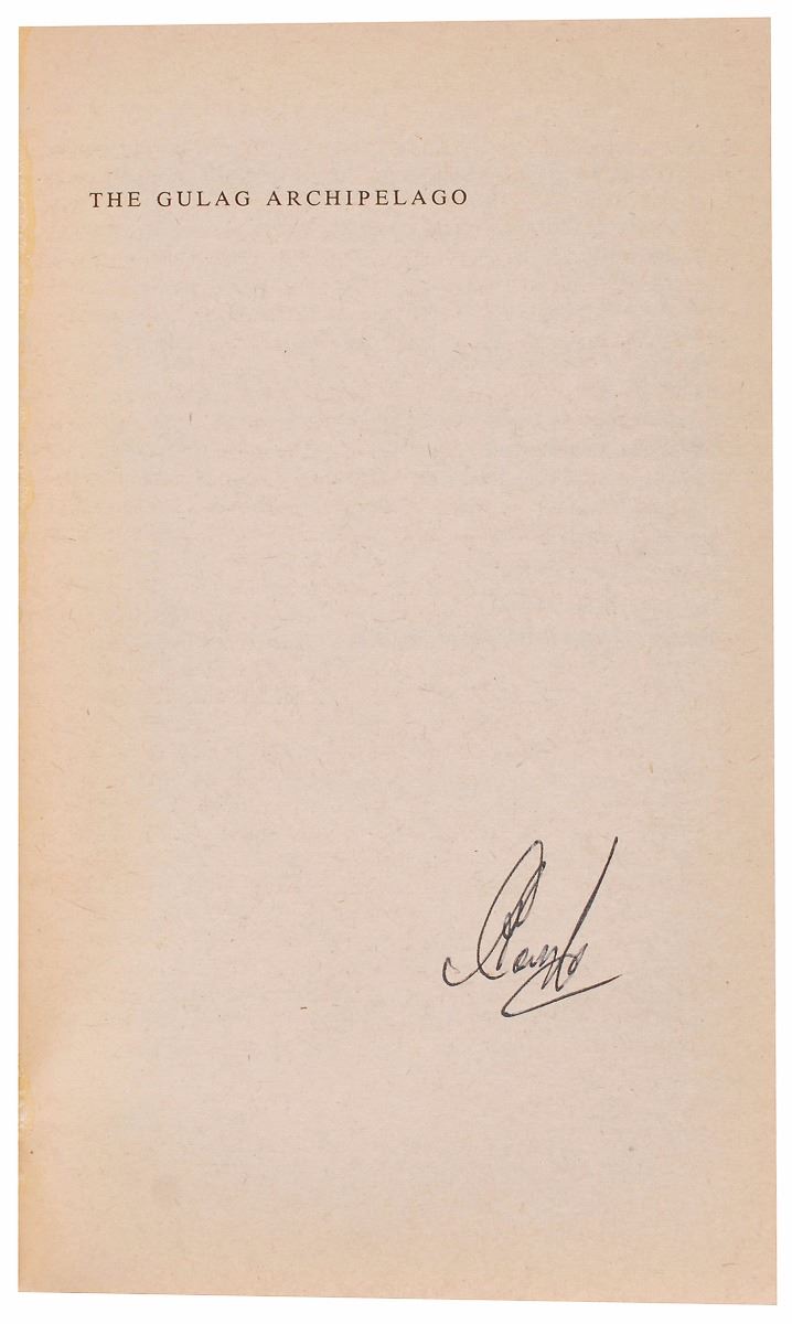 Signed book: The Gulag Archipelago. NY: Harper & Row, 1974. Softcover, 4.25 x 7, 660 pages. Signed on the half-title page in black ballpoint. In very good condition, with edgewear and some creasing to spine and covers.
