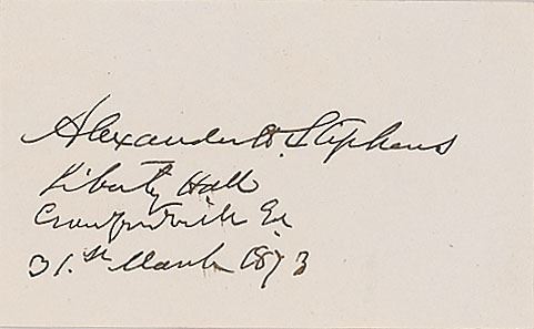 Crisp ink signature, "Alexander A. Stephens, Liberty Hall, Crawfordville, Ga., 31st March 1873,” on an off-white 3.5 x 2.25 card. In very fine condition.