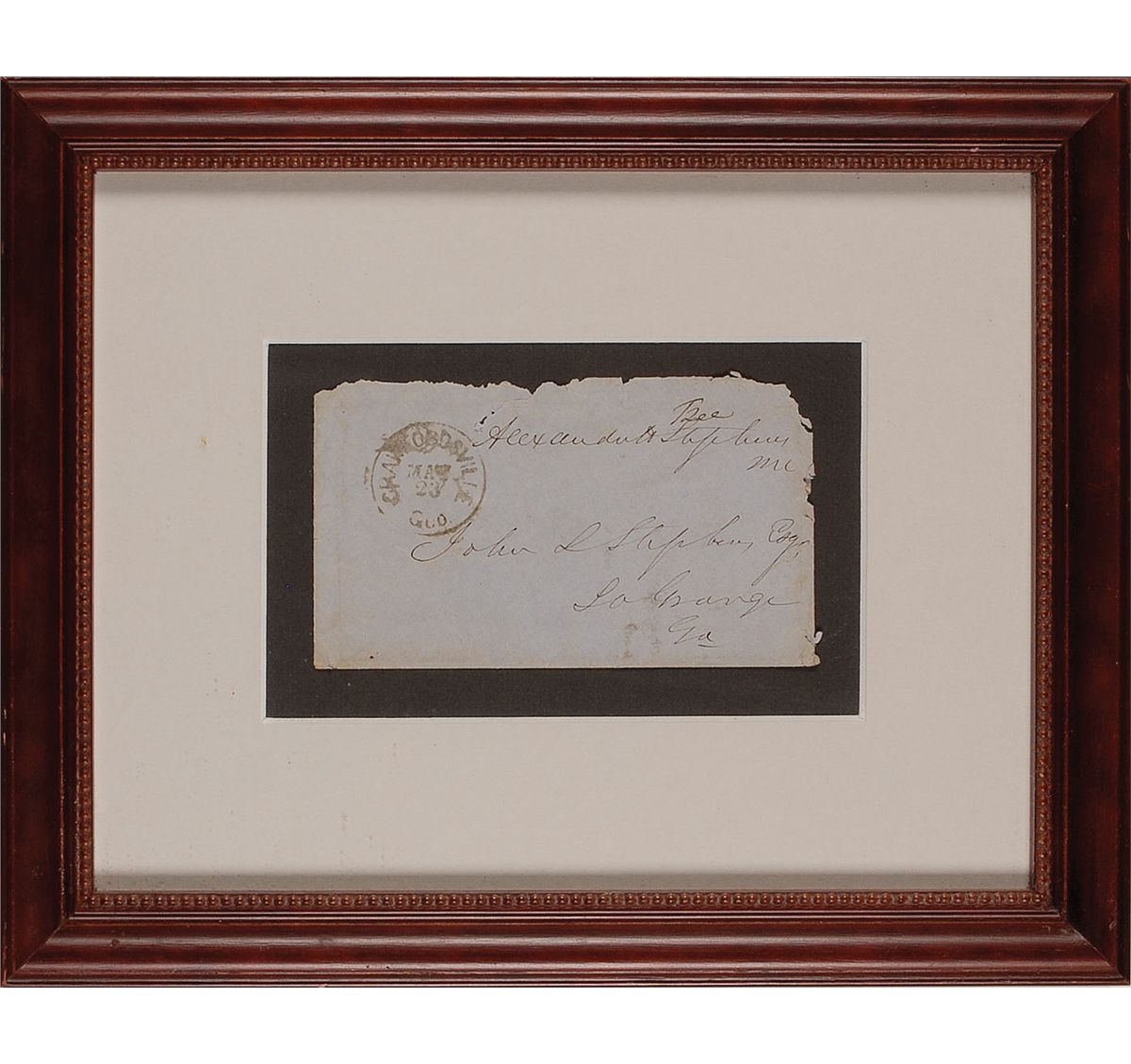 Vice President of the Confederacy (1812–1883) under Jefferson Davis. Hand-addressed free franked envelope panel, addressed by Stephens to “John L. Stephens, La Grange, Ga.,” and franked in the upper right, “Free, Alexander Stephens, mc.” Panel also bears a May 23, Crawfordsville, Georgia, postmark. Matted and framed to an overall size of 12 x 9.5. In very good condition, with some scattered light toning and soiling, paper loss to two edges, and a light vertical crease to left side.