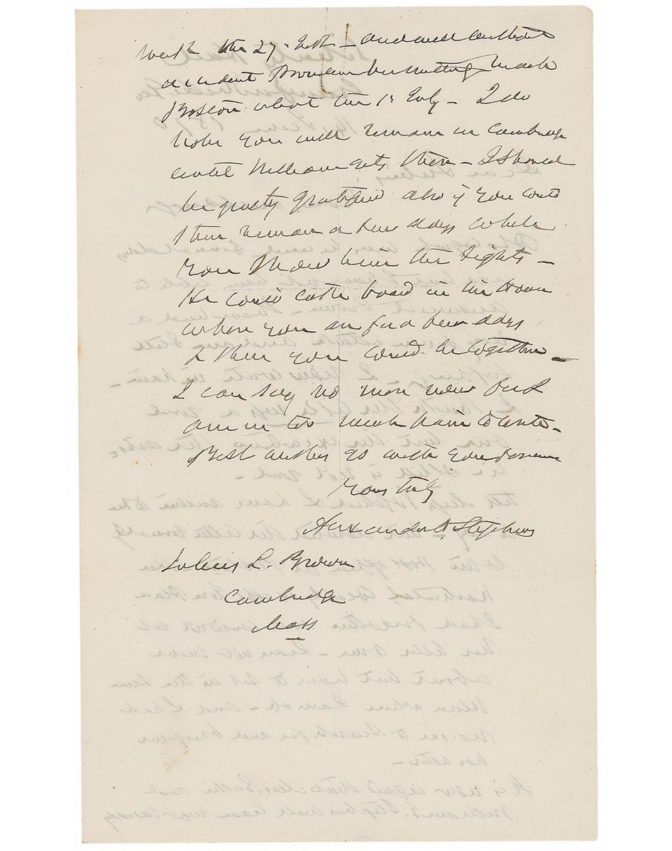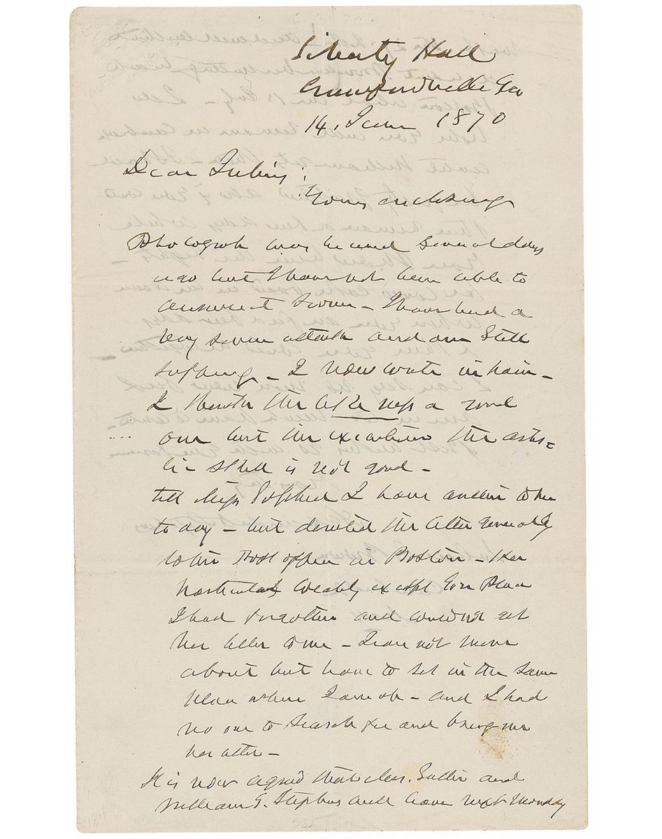 Vice President of the Confederacy (1812–1883) under Jefferson Davis. ALS, one page both sides, 5 x 8, Liberty Hall, Crawfordville, Georgia, June 14, 1870. Letter to Julius L. Brown of Cambridge, Massachusetts. In part: “Your enclosed photograph was received several days ago but I have not been able to answer it soon. I have had a severe attack and am still suffering. I now write in pain. I think the likeness a good one but in execution the artistic skill is not good.” In fine condition, with intersecting folds, one through a single letter of signature, partial separation to hinge, and a couple light creases.