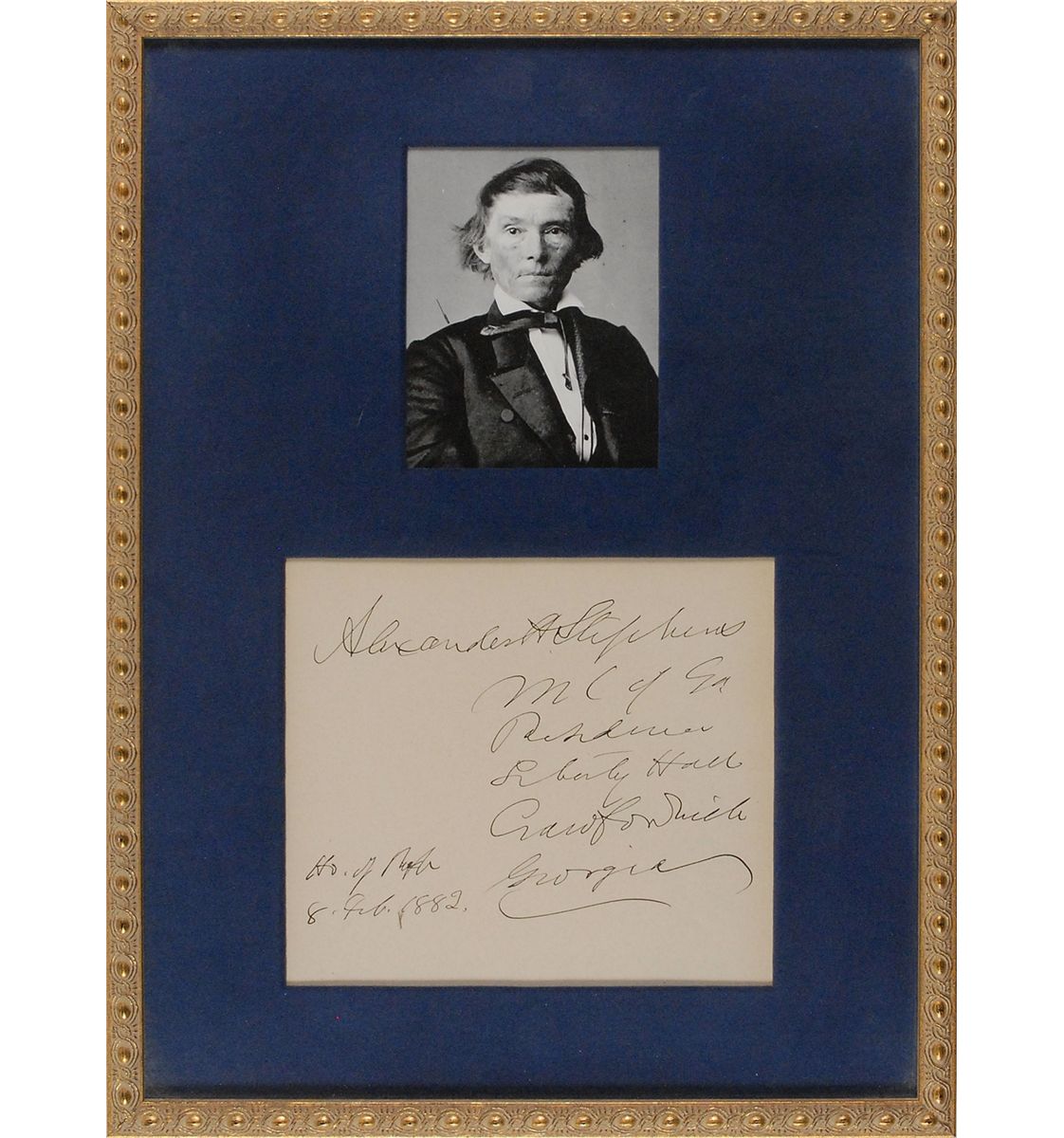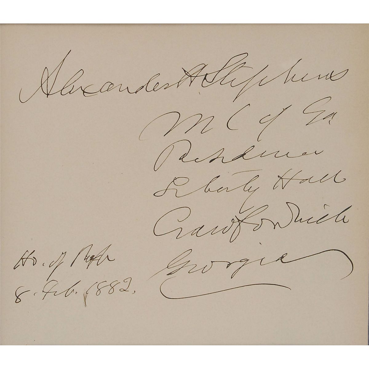 Georgia politician (1812-1883) who served as vice president of the Confederacy during the Civil War. Large ink signature, “Alexander H. Stephens, MC of Ga, Residence, Liberty Hall, Crawfordville, Georgia, Ho. of Rep, 8 Feb., 1882,” on an off-white 6.5 x 6 album page. Matted and framed with portrait of Stephens to an overall size of 11.5 x 15.5. In fine condition.