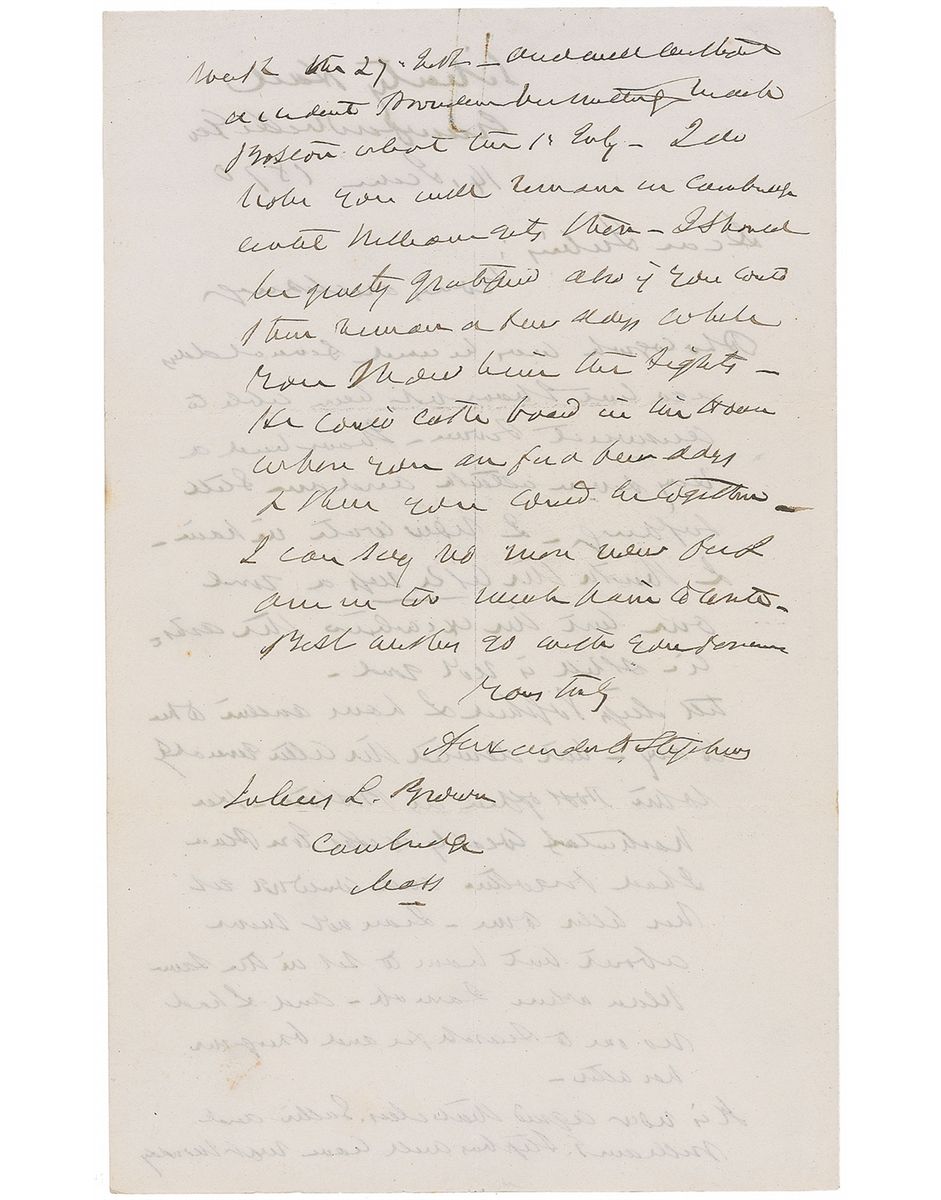 Vice President of the Confederacy (1812–1883) under Jefferson Davis. ALS, one page both sides, 5 x 8, Liberty Hall, Crawfordville, Georgia, June 14, 1870. Letter to Julius L. Brown of Cambridge, Massachusetts. In part: “Your enclosed photograph was received several days ago but I have not been able to answer it soon. I have had a severe attack and am still suffering. I now write in pain. I think the likeness a good one but in execution the artistic skill is not good.” In fine condition, with intersecting folds (one through a single letter of signature), partial separation to hinge, and a couple light creases.