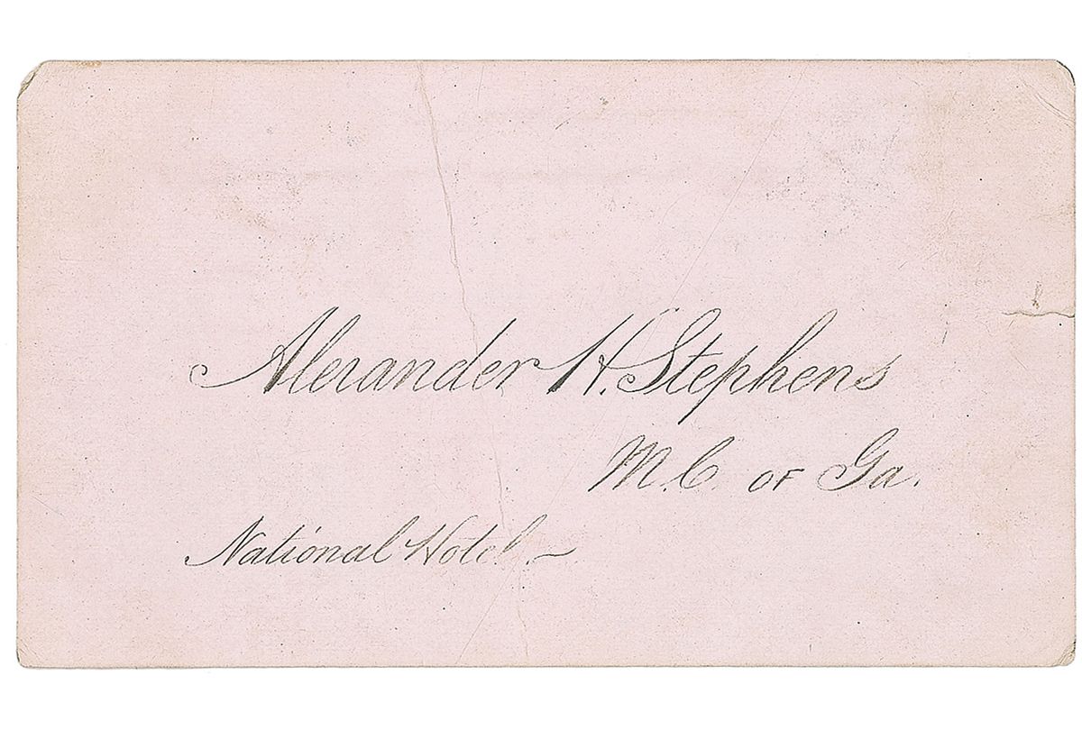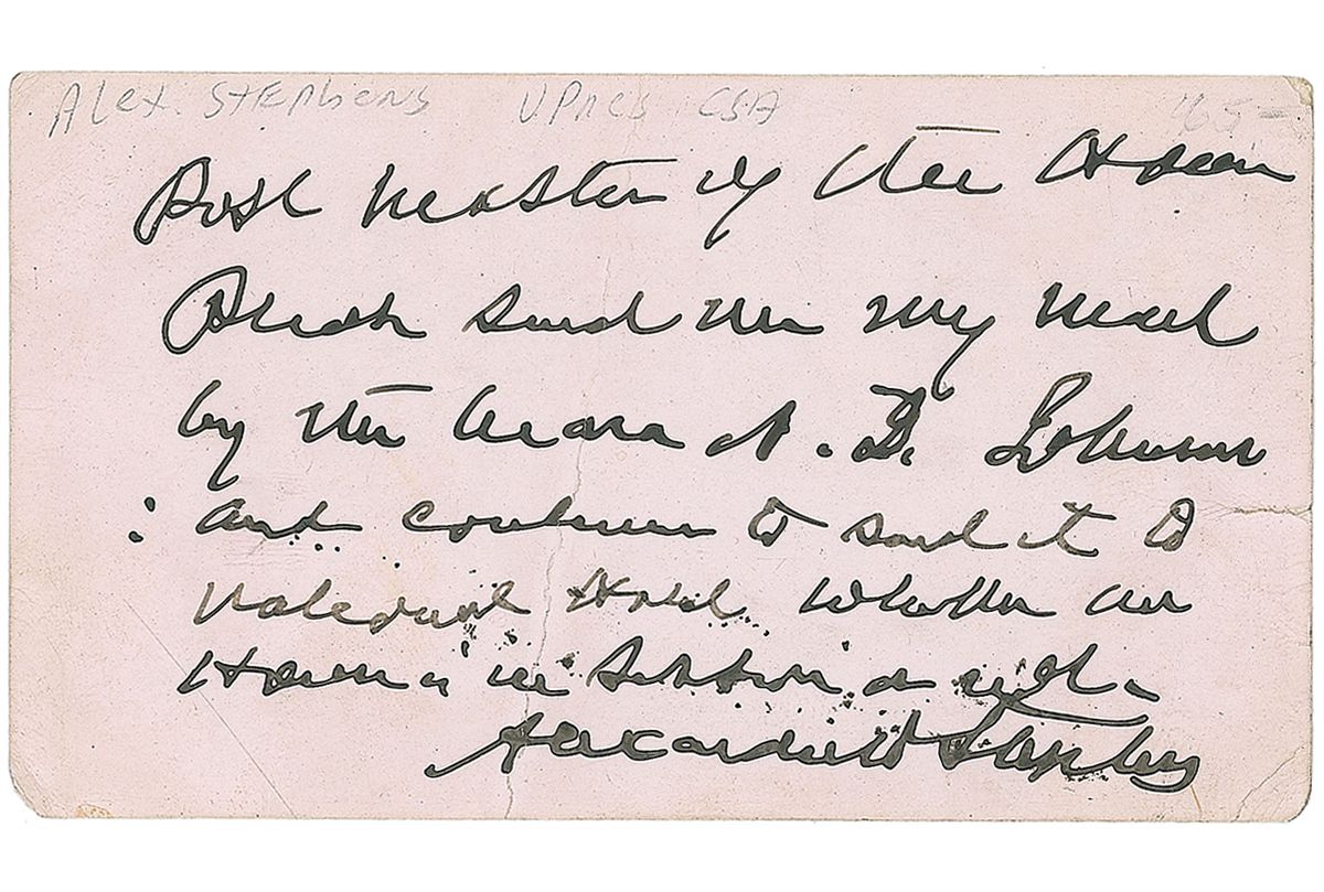 ANS signed “Alexander H. Stephens,” on the reverse of Stephens’s personal calling card engraved with his name and title as a congressman of Georgia, 3.25 x 2, no date. A note to the postmaster of the House with directions on where to send his mail. In very good condition, with a significant vertical crease, small edge tear, and corner tip dings.