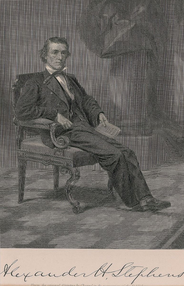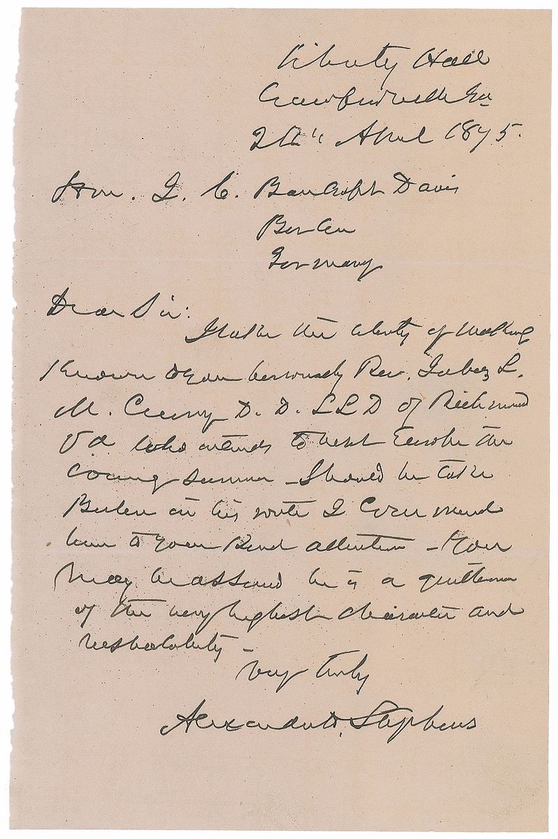 ALS, one page, 4.5 x 7, April 20, 1875. Letter to former assistant secretary of state Bancroft Davis, concerning Reverend Jabez L. M. Curry of Richmond, Virginia, in part: “Should he take Berlin in his route I commend him to your kind attention. You may be assured he is a gentleman of the highest character and respectability.” In fine condition. Accompanied by an engraved portrait of Stephens bearing a preprinted facsimile signature.