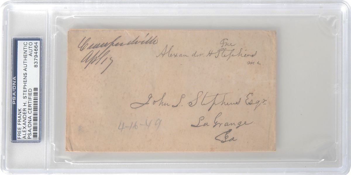 Hand-addressed mailing envelope, 5.5 x 3, addressed in Stephens’s hand to “John L. Stephens Esq’r, La Grange, Ga.,” and franked in the upper right, “Free, Alexander H. Stephens, MC.” Encapsulated in a plastic PSA/DNA authentication holder. In very good to fine condition, with light overall mottled toning.