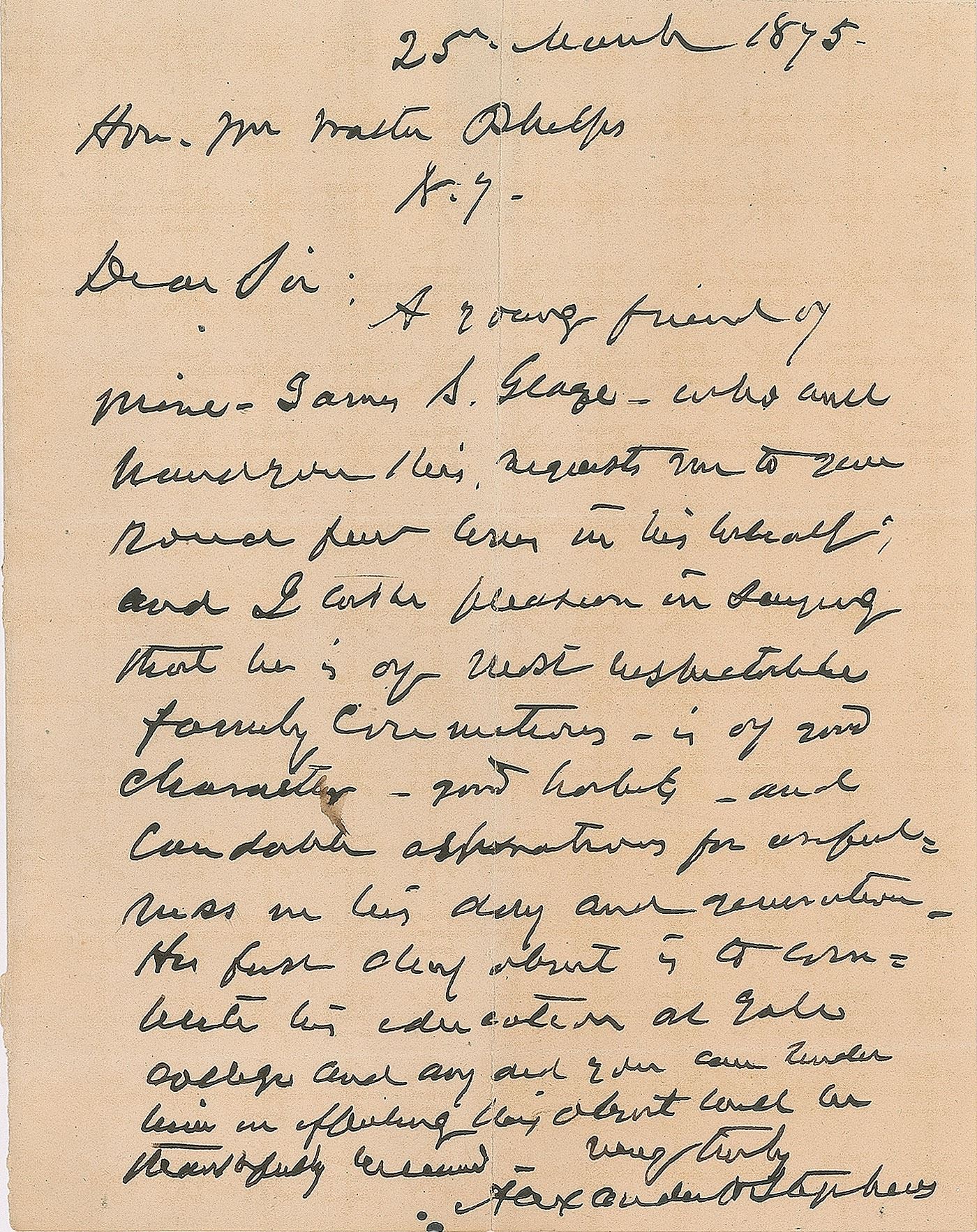 ALS signed “Alexander H. Stephens,” one page, 4.75 x 6, March 25, 1875. Letter of introduction and recommendation to the Hon. William Walter Phelps, in part: "A young friend of mine, James S. Glaze, who will hand you this…is of good character, good habits, and…is to complete his education at Yale College." In fine condition, with trimmed edges, and a split to the vertical fold passing through the signature. Phelps had just completed his term as one of New Jersey's congressman, and would later serve as US ambassador to Austria-Hungary and Germany. Phelps had graduated from Yale as valedictorian of his class in 1860.