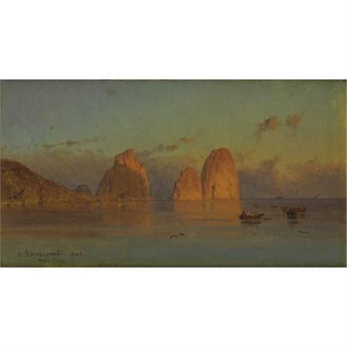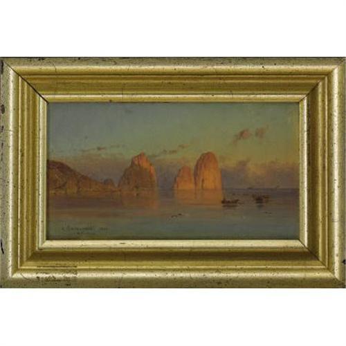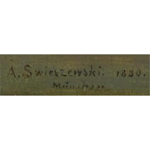 <B>ALEXANDER SWIESZEWSKI </B></I>(Polish 1839-1895)<BR><I>Boaters at Sunset</B></I>, 1880<BR>Oil on board<BR>5 x 8-1/2 inches (12.7 x 21.6 cm)<BR>Signed lower left: <I>A. Swieszewski 1880</B></I><BR> <B>Condition Report:</B> Overall good condition<BR><BR><b>Shipping:</b> Requires 3rd Party Shipping (<a target="_blank" href="http://www.heritageauctions.com/common/shipping.php">view shipping information</a>)