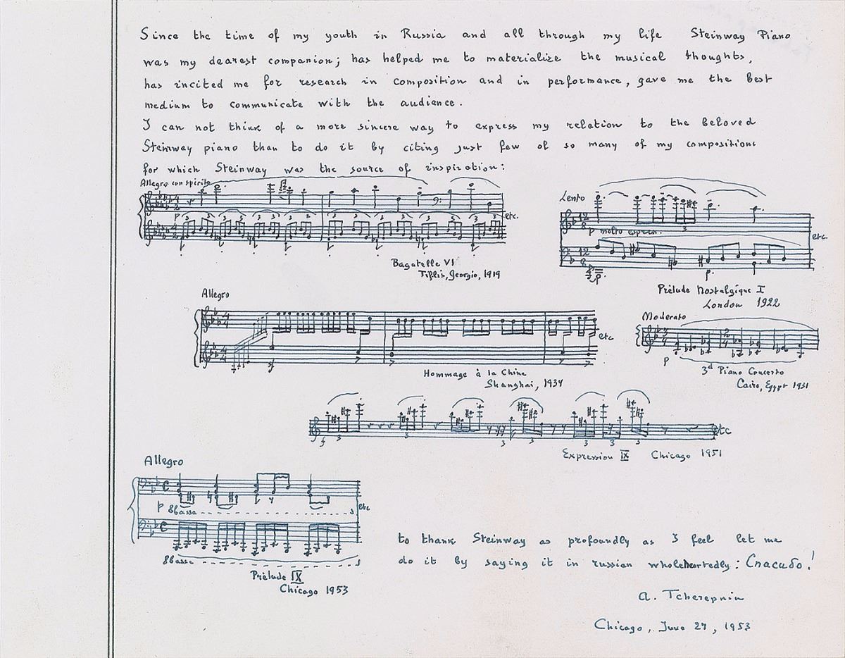 Russian composer and pianist (1899–1977) Excellent combination of AMQSs and an autograph testimonial on a white 10.25 x 8 sheet, signed at the conclusion, “A. Tcherepnin, Chicago, June 27, 1953.” Tcherepnin pens six musical quotations from various works, adding a lengthy testimonial for the Steinway piano company, in part: “Since the time of my youth in Russia and all through my life Steinway Piano was my dearest companion; has helped me to materialize the musical thoughts, has incited for me for research in composition and in performance, gave me the best medium to communicate with the audience. I can not think of a more sincere way to express my relation to the beloved Steinway piano than to do it by citing just a few of my compositions for which Steinway was the source of inspiration.” In fine condition.