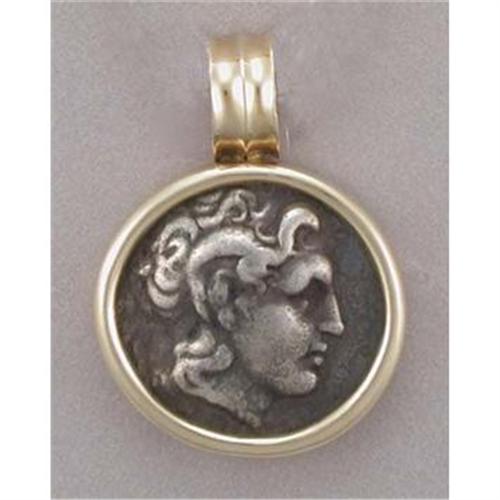 Beautiful and impressive! This Greek coin (Thrace) is a silver tetradrachm of approximately 28MM, made between 286-281 BC by one of Alexander the Great's successors, Lysimachos. The obverse, facing forward, depicts the head of the deified Alexander the Great, wearing the horn of Ammon (considered to be the most accurate depiction of Alexander's actual features)in beautiful high relief. The reverse shows a seated Athena Nikephoros.The coin is set in a modern 14K mounting. Its overall diameter in the mounting is 30MM in width and 40MM in height(including the bail) and is almost 5MM in depth. Includes a nice large but lightweight 24" chain. The whole piece weighs 38.3 grams, a large striking piece. Comes accompanied by a certificat of authenticity signed by David R. Sear, Professional Numismatist and author of Greek Coins and Their Values.