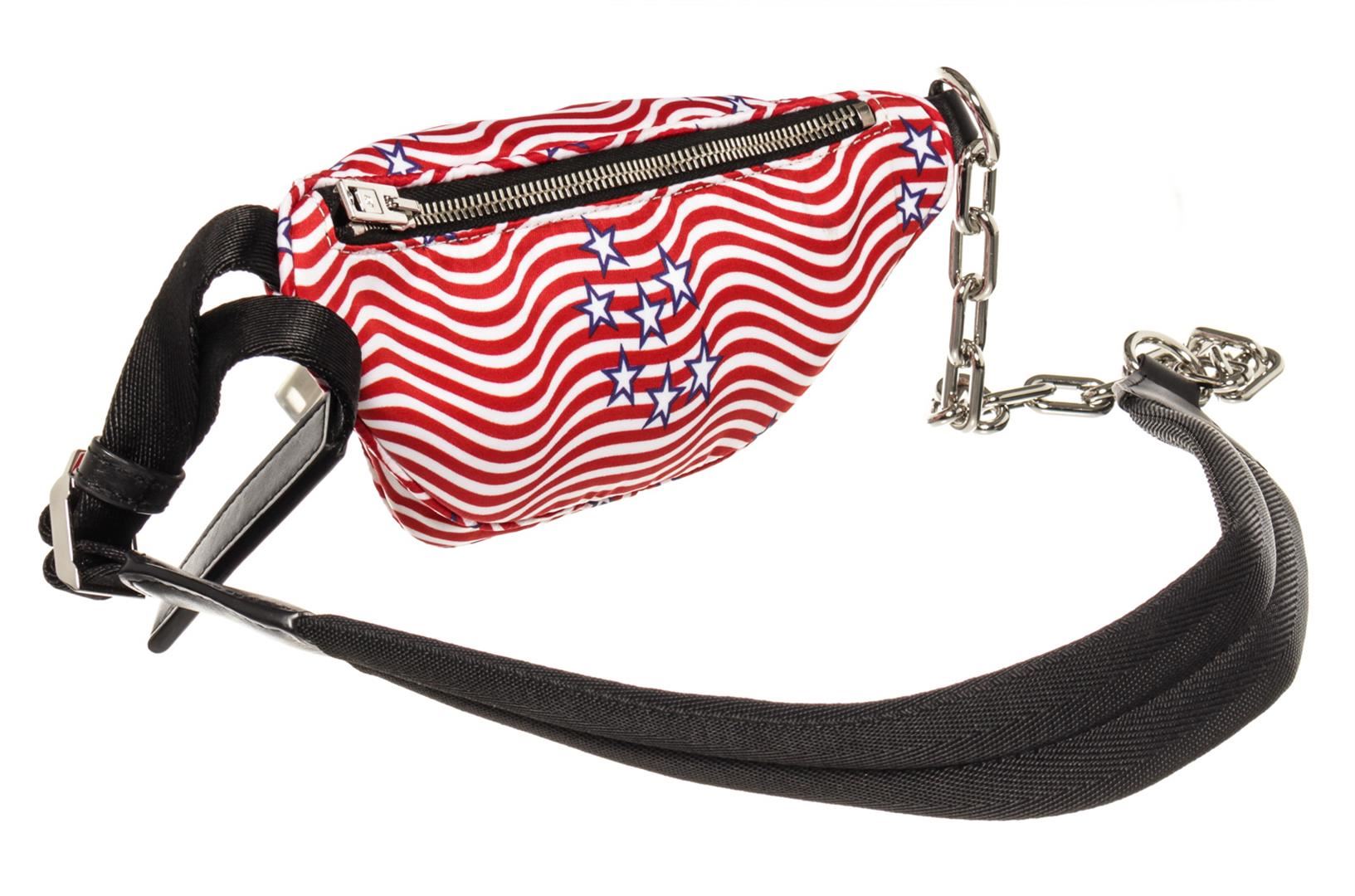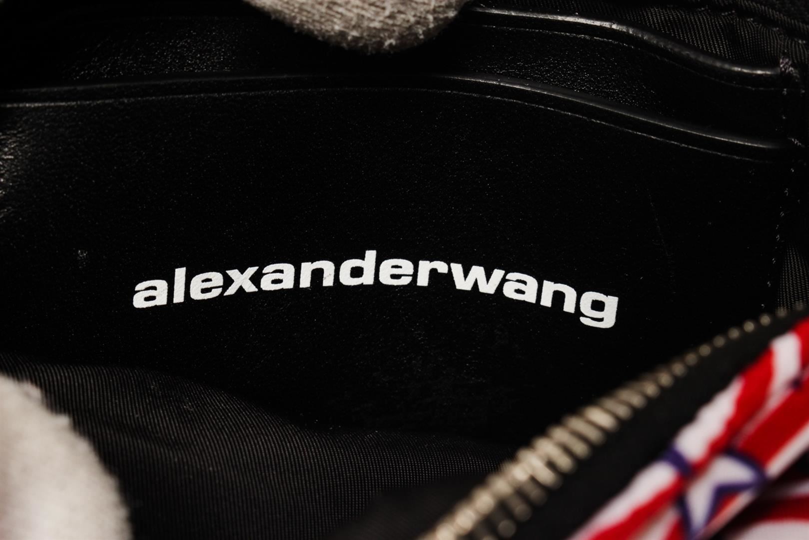 One Alexander Wang Red Monogram Nylon Attica Waist Bag. Item is sold AS-IS. All available information is listed in the description and shown in the photo. Red printed monogram nylon Alexander Wang Attica waist bag with silver-tone hardware, black leather trim, adjustable waist strap, three exterior pockets, black nylon lining and zip closure at top. Height: 3.5" Width: 9" Depth: 1.75" Strap Length: 45"