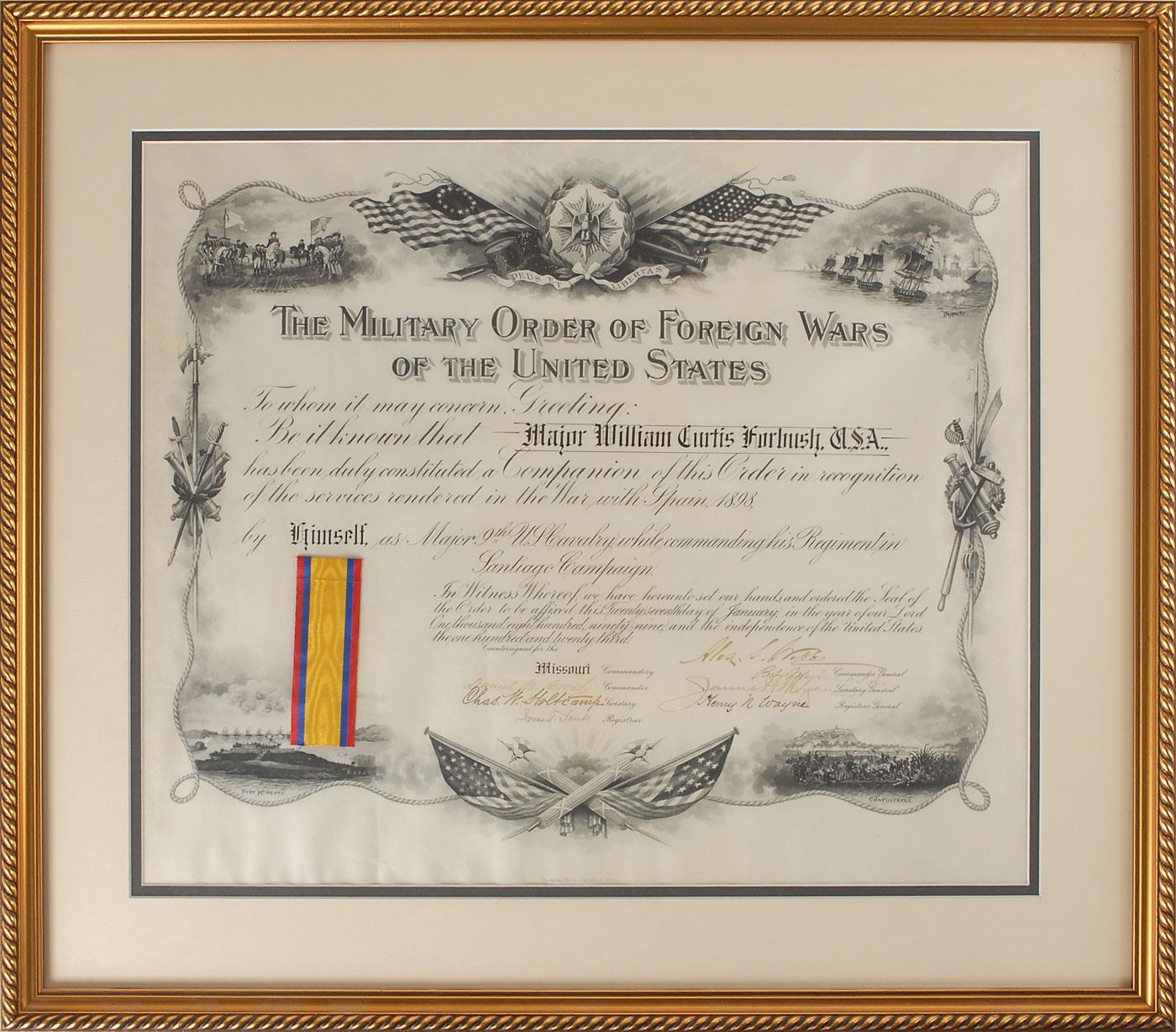 Uncommon partly-printed DS, signed "Alex. S. Webb ," one page, 18.5 x 15.5, January 27, 1899. Military order in which Major William Curtis Forbush "has been duly constituted a Companion of this Order in recognition of the services rendered in the War with Spain, 1898, by himself, as Major 9th U.S. Cavalry, while commanding his Regiment in Santiago Campaign." Signed at the conclusion by Webb. The red, blue, and yellow ribbon remains affixed to the lower left. Double-matted and framed. In fine condition.