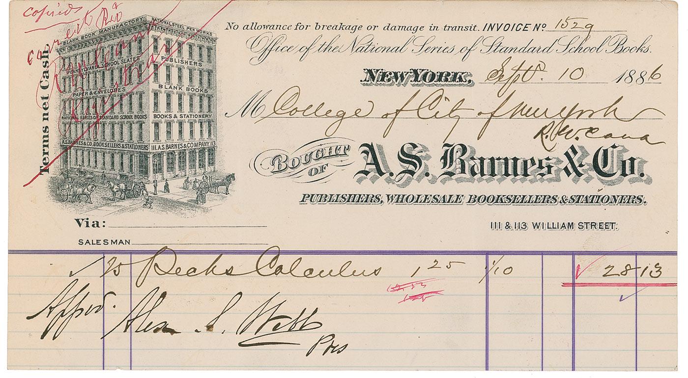 Union general who received the Medal of Honor for leading the Philadelphia Brigade in the face of Pickett’s Charge at Gettysburg. After the war he spent thirty years as President of City College of New York. DS, signed “Alex. S. Webb, Pres.,” one page, 8.5 x 4.75, September 10, 1886. Receipt for “20 Pecks Calculus,” signed at the bottom by Webb. Two vertical folds, one through a single letter of signature, uniform toning, and expected ink notations, otherwise fine condition.