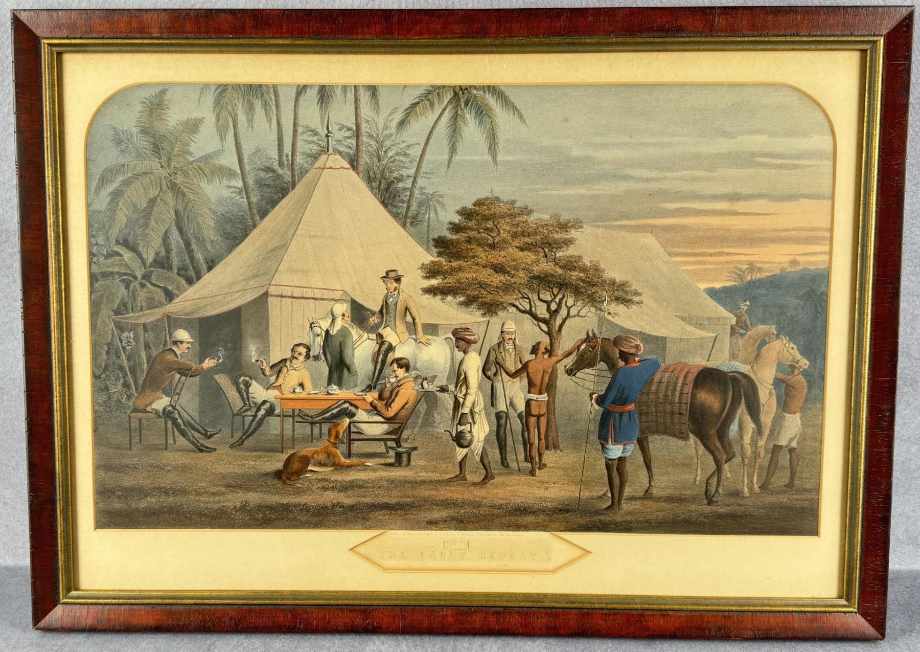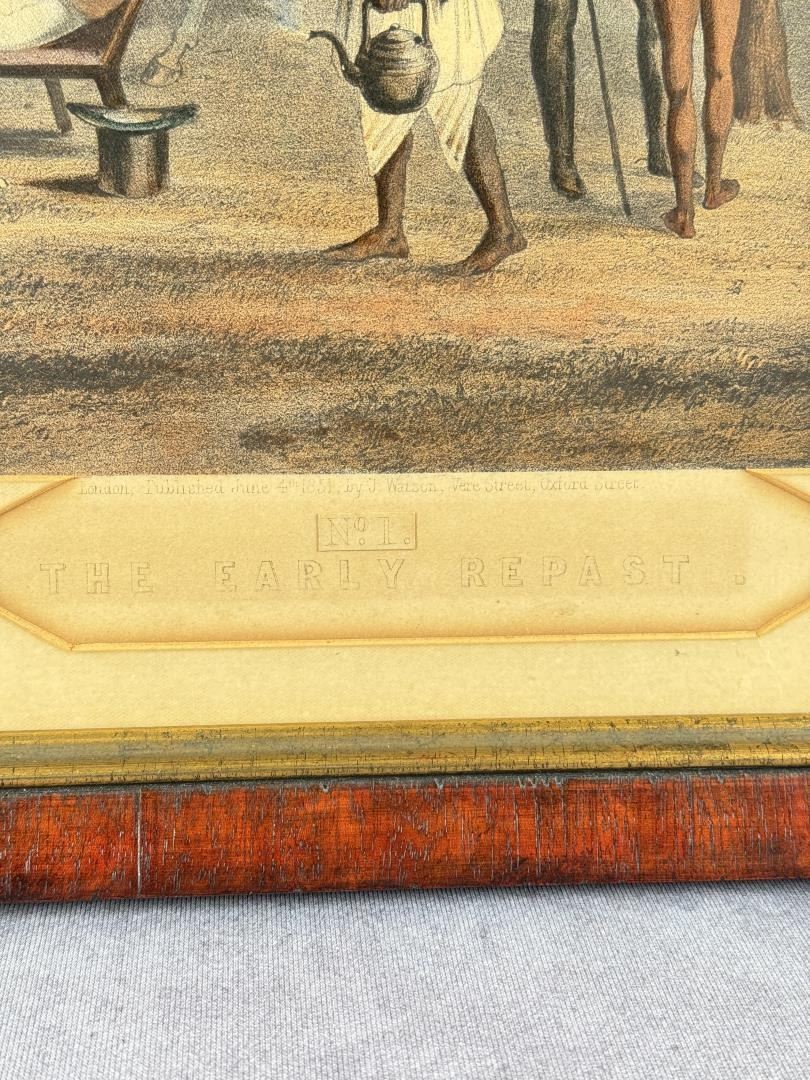 18 1/2" by 25 1/2" framed. Boar Hunting: The Early Repast; The Jungle Side, The Boar Breaking; The Wounded Boar, Charging; and The Death of the Boar hand colored lithographs, published by J. Watson, London, 1851.