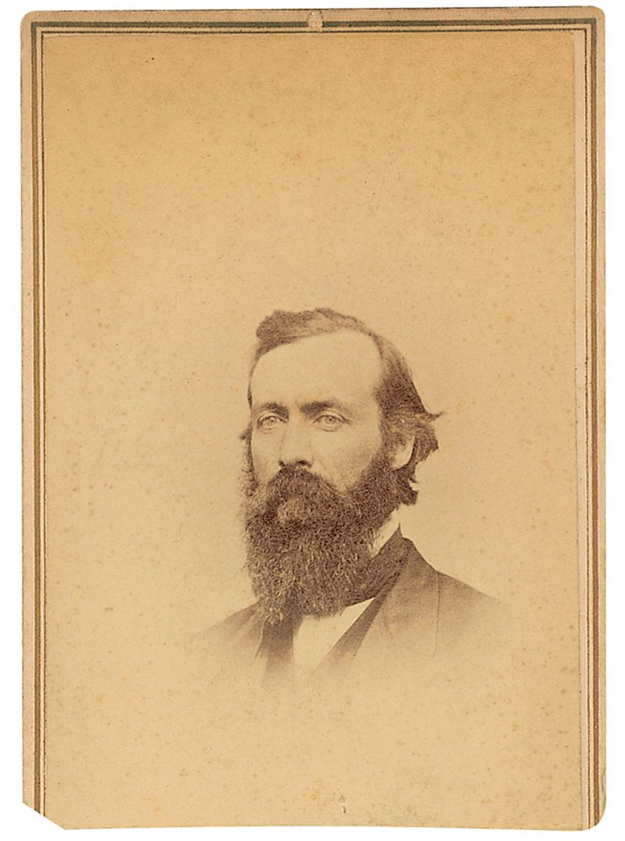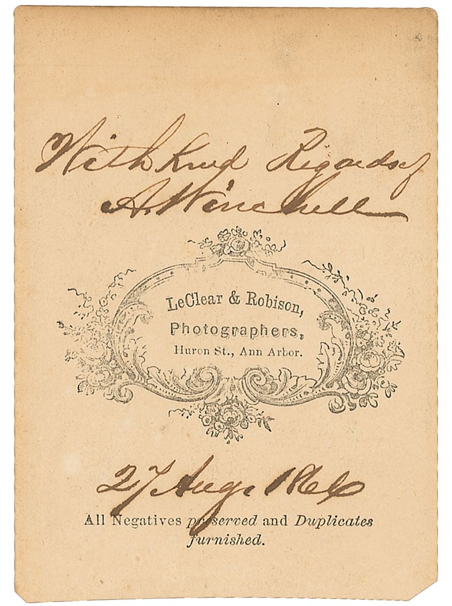 American geologist (1824–1891). Original 2.5 x 3.25 carte-de-visite bust portrait by LeClear & Robison of Ann Arbor, signed on the reverse in black ink, “With kind regards of A. Winchell, 27 Aug. 1866.” In very good condition, with scattered toning and soiling, and a trimmed bottom edge.