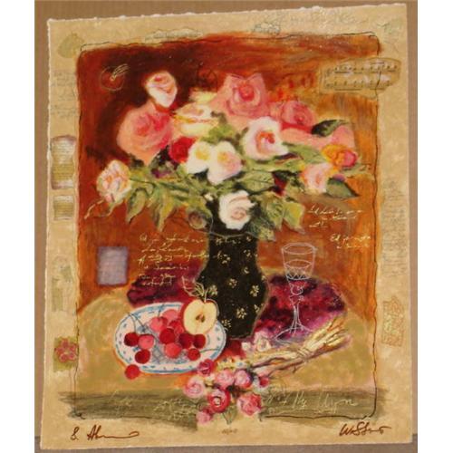 Art that is laced with nostalgia, romanticism and vitality by this world famous husband and wife team. Evening is a 21x17 in. serigraph, signed by the artists and numbered in an edition of 450. Domestic shipping-$20, International depending upon location. The serigraphs of Tanya Wissotzky and Alexander Galtchansky are created by the interaction of two independent imaginations working in intellectual and aesthetic harmony. Superimposed upon the beautiful flowers are excerpts of calligraphy from old English flower painting manuals. In the still lifes, the classically executed centerpiece has all the nostalgia and romanticism of a time past, the color rich and sensuous. Juxtaposed against this are the music scores, totally dry and abstract and yet evocative of gaiety and pleasure. Tanya Wissotzky and Alexander Galtchansky were born in the same year, 1959, in Crimea (U.S.S.R.). Their careers began in art school. Alexander studied in Dnepropetrovsk and Wissotzky in Simferopol. They continued their studies at the Kiev institute of the Arts; Wissotzky as a painter and Alexander as a book illustrator. After getting married, they emigrated to Israel. Having found themselves in a drastically different situation and place, they united their creative activities and began working together.