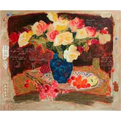 The serigraphs of Tanya Wissotzky and Alexander Galtchansky are created by the interaction of two independent imaginations working in intellectual and aesthetic harmony. Superimposed upon the beautiful flowers are excerpts of calligraphy from old English flower painting manuals. In the still lifes, the classically executed centerpiece has all the nostalgia and romanticism of a time past, the color rich and sensuous. Juxtaposed against this are the music scores, totally dry and abstract and yet evocative of gaiety and pleasure. Tanya Wissotzky and Alexander Galtchansky were born in the same year, 1959, in Crimea (U.S.S.R.). Their careers began in art school. Alexander studied in Dnepropetrovsk and Wissotzky in Simferopol. They continued their studies at the Kiev institute of the Arts; Wissotzky as a painter and Alexander as a book illustrator. After getting married, they emigrated to Israel. Having found themselves in a drastically different situation and place, they united their creative activities and began working together.