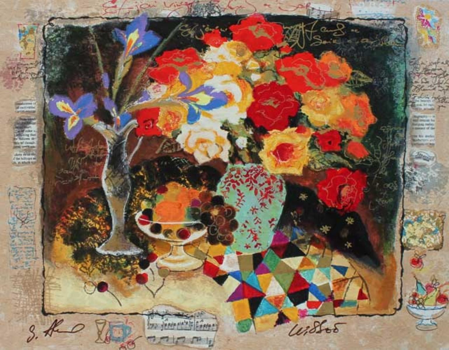 Artist: Alexander & Wissotzky - Title: Autumn Flowers III - Medium: Serigraph on Wood - Signature: Hand-signed by the Artist - Limited Edition: 195 - Image Size: Approximately 14.75 inches x 19.5 inches - Framed: Unframed - Details: This work comes with a Certificate of Authenticity - The work of Alexander and Wissotzky has received critical acclaim and success in both Israel and abroad and can be found in public and private collections all over the world. Sadly, Tanya Wissotzky lost her battle with cancer in November of 2006.Alexander Galtchansky has also passed away just a few years later.