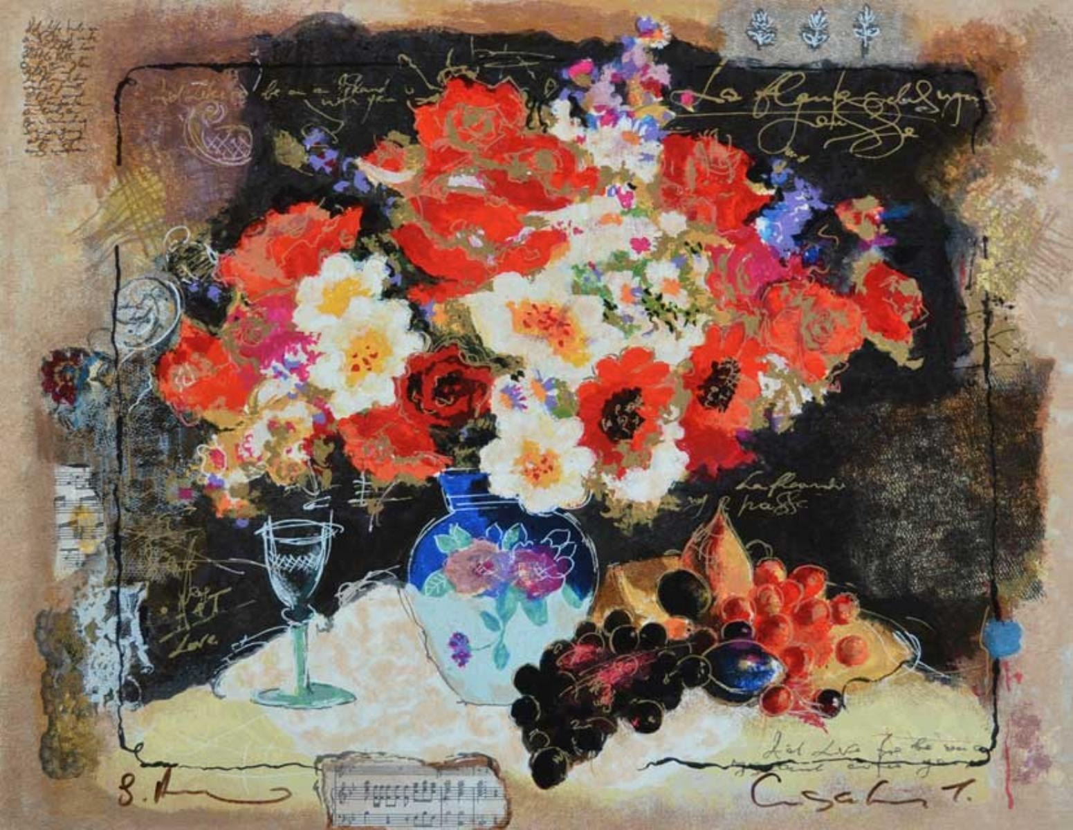 Artist: Alexander & Wissotzky - Title: Flowers with a Glass of Wine - Medium: Serigraph on Wood - Signature: Hand-signed by the Artist - Limited Edition: 195 - Image Size: Approximately 15.25 inches x 19 inches - Unframed - Details: This work comes with a Certificate of Authenticity - The work of Alexander and Wissotzky has received critical acclaim and success in both Israel and abroad and can be found in public and private collections all over the world. Sadly, Tanya Wissotzky lost her battle with cancer in November of 2006.Alexander Galtchansky has also passed away just a few years later.