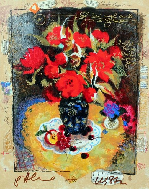 Artist: Alexander & Wissotzky - Title: Seasonal Cherries - Medium: Serigraph on Paper - Signature: Hand-signed by the Artist - Limited Edition: 495 - Image Size: Approximately 12.5 inches x 9.75 inches - Framed: Unframed - Details: This work comes with a Certificate of Authenticity - The work of Alexander and Wissotzky has received critical acclaim and success in both Israel and abroad and can be found in public and private collections all over the world. Sadly, Tanya Wissotzky lost her battle with cancer in November of 2006.Alexander Galtchansky has also passed away just a few years later.