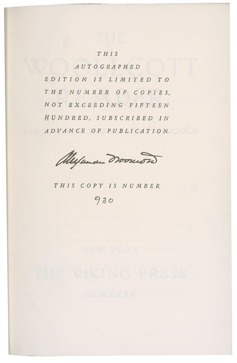 Critic and commentator for The New Yorker magazine and a member of the Algonquin Round Table(1887–1943). He was the inspiration for Sheridan Whiteside, the main character in the play The Man Who Came to Dinner. Signed book: The Woollcott Reader. First edition, first printing. NY: Viking Press, 1935. Hardcover with slipcase, 6 x 8.5, 1010 pages. Signed on the limitations page in black ink. In fine condition, with some mild rippling to signed page and tops of other pages, light toning to both pastedowns, and some scattered light toning and soiling to covers and spine. Dustjacket exhibits light corner and edge wear.