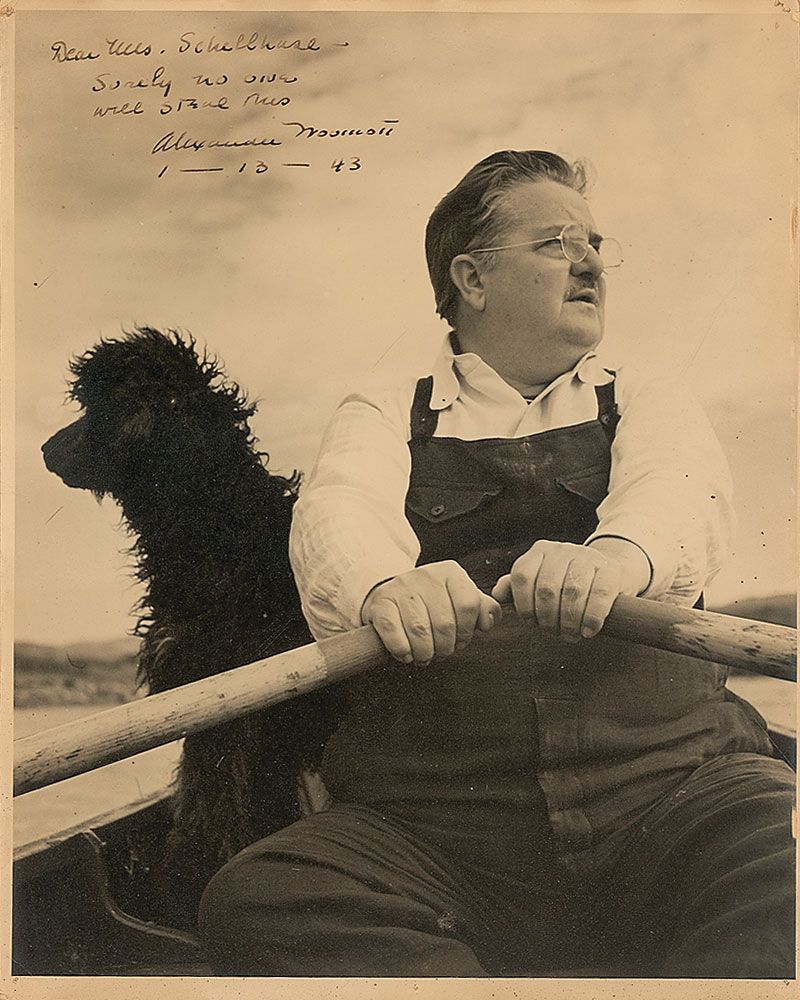 Vintage pearl-finish 8 x 10 photo of Woolcott in a rowboat with his dog, signed and inscribed in fountain pen, “Dear Mrs. Schellhase—Surely no one will steal this, Alexander Woolcott, 1-13-43.” A single tack hole to each corner tip and some scattered light bends and creases, otherwise fine condition.