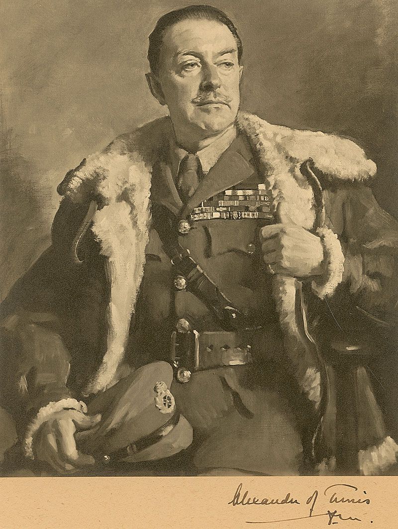 Supreme Allied commander of the Mediterranean theater in World War II (1891–1969). Vintage matte-finish 8 x 9.5 photo of a painted portrait of Alexander in distinguished attire, affixed to an 8 x 10.5 mount, signed on the mount in fountain pen, “Alexander of Tunis, F. M.” In fine condition, with trimmed edges.