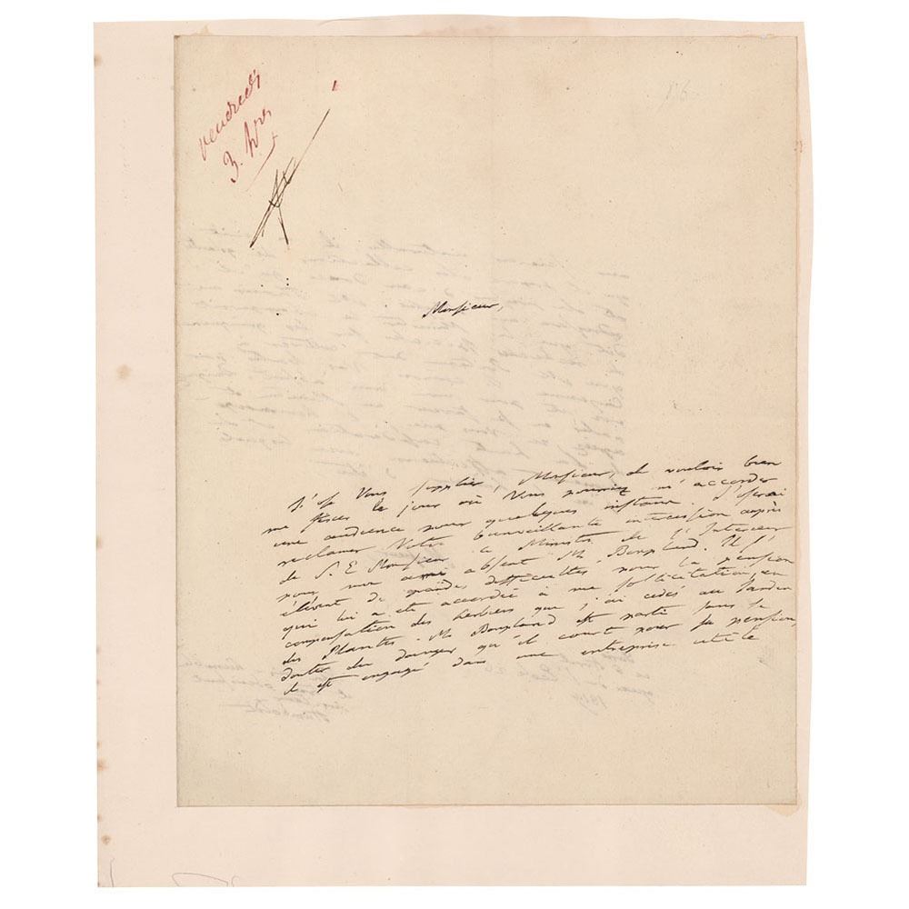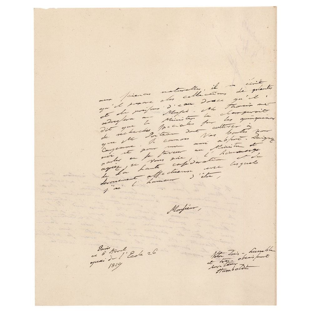 ALS in French, signed “Humboldt,†one page both sides, 7.25 x 9, April 6, 1819. Untranslated handwritten letter by Humboldt, referring to "sciences naturelles." The integral leaf has been professionally inlaid into a slightly larger sheet. In fine condition.
