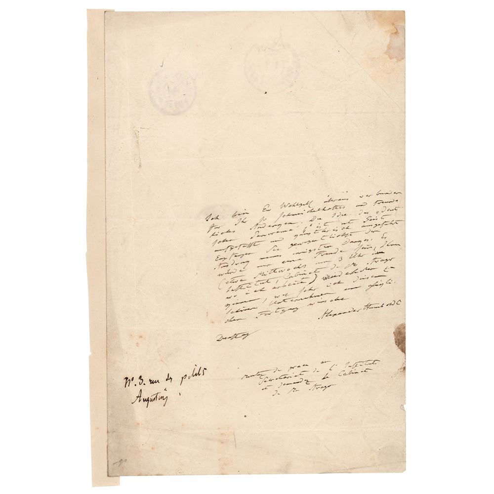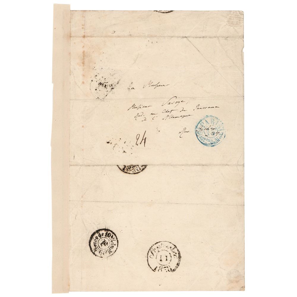 ALS in German, one page, 5.25 x 8.25, no date. Handwritten letter to "Monsieur Savoye," care of the chief of the German Panorama, in part (translated): "The idea of the German Panorama is conceived with intelligence and artistically directed. Most kindly accept the expression of my most cordial thanks. It would be a pleasure to me to be able to repeat to youhow much I wish this noble undertaking godspeed." In very good to fine condition, with overall wrinkling, staining to edges, and a mounting strip to the left side.