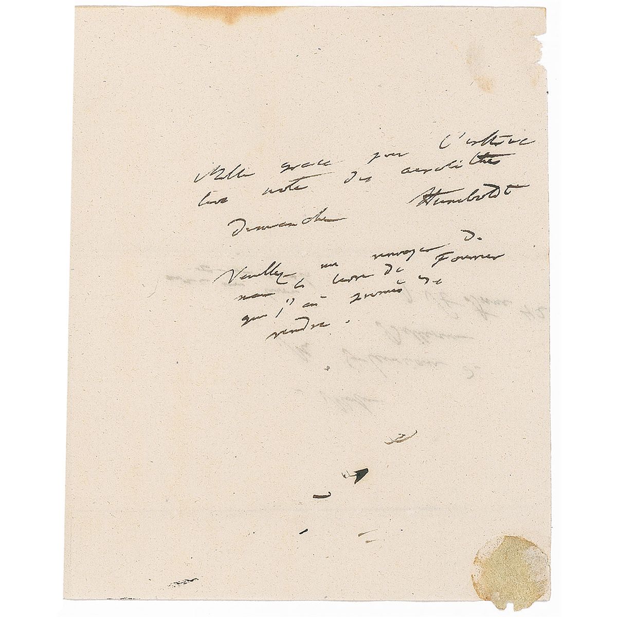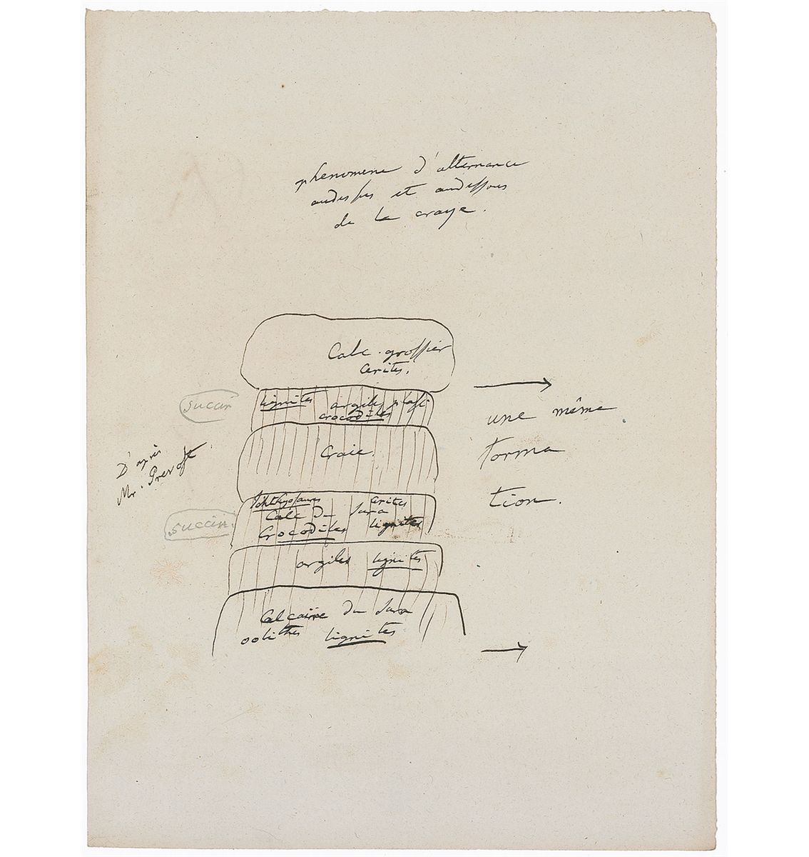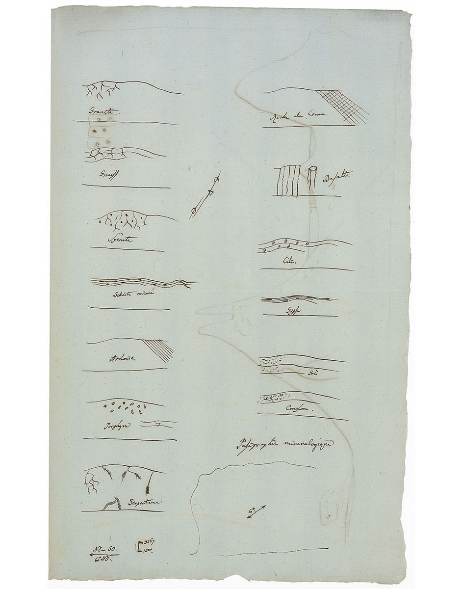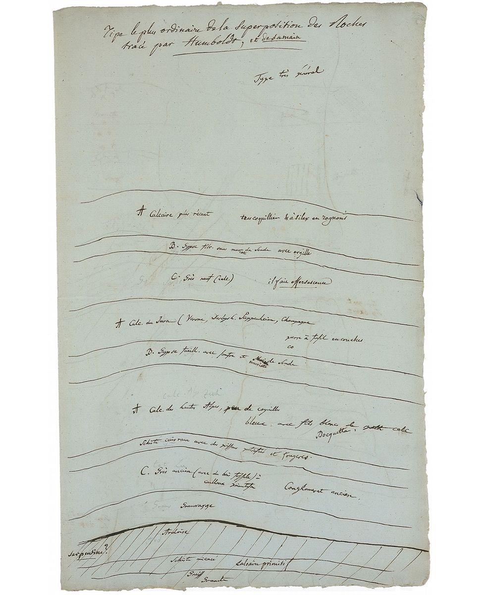 ALS in French, signed “Humboldt,” three pages on two adjoining sheets, 4.75 x 4.75, no date [likely circa 1822-23]. Letter to mineralogist Louis-Benjamin Fleuriau de Bellevue, sending his friend Fourier’s book, in part (translated): “in which the problem of heat movement is completely solved. Ridges and edges are special cases only….You will also see in paragraph 52 that the author believes as I do that the heat cannot be compared to any fluid, water in oil….I am asking you to please let me visit you on Wednesday at 11 a.m.” Includes multiple detailed geological sketches and diagrams: first set is four pages on two adjoining sheets, 8 x 12.75, featuring descriptions of earth formations (clay, chalky, and lignite); a large diagram related to the superposition of rocks, with descriptions of each one’s appearance and type; sketches of landscapes; and numerous small sketches of various earth and rock textures, including granite, syenite, gypsum, and limestone; and another sketch of a superposition diagram on an off-white 7 x 9.5 sheet. In overall fine condition. Accompanied by a large print entitled ‘A Proportional and Tabular View of the Superior, Supermedial, and Medial Rocks.’