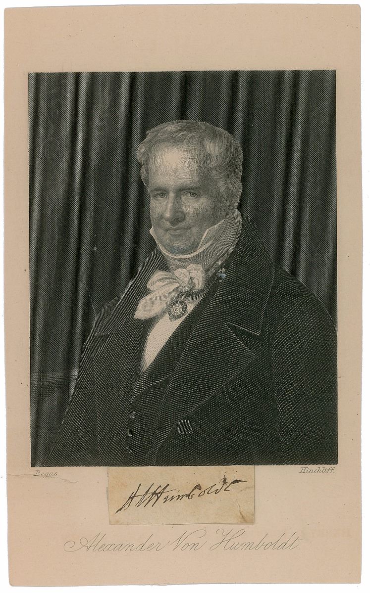German naturalist and explorer (1769–1859) who wrote Kosmos, a massive five-volume study which attempted to unify the various branches of man’s knowledge. Ink signature, “A. v. Humboldt,” on an off-white clipped slip affixed to a 3.5 x 6 engraved portrait. In fine condition.
