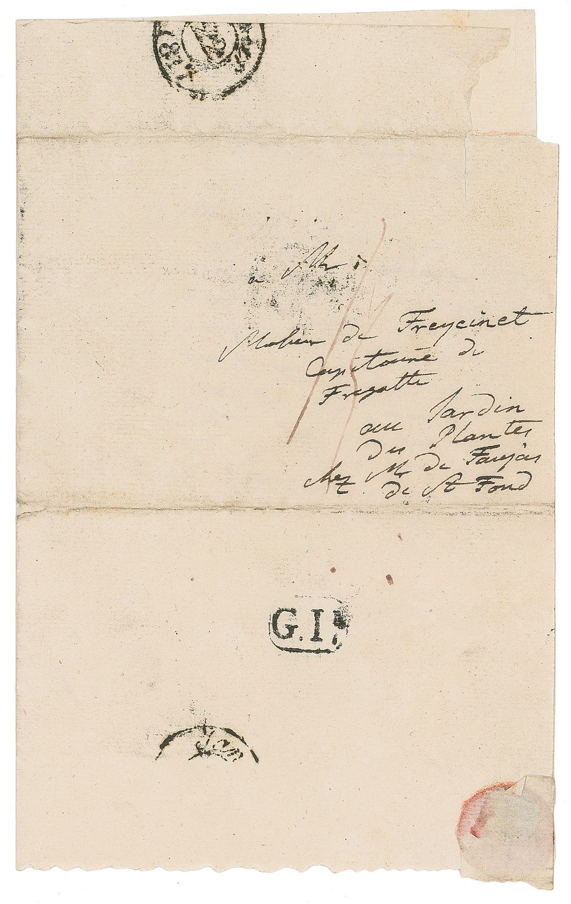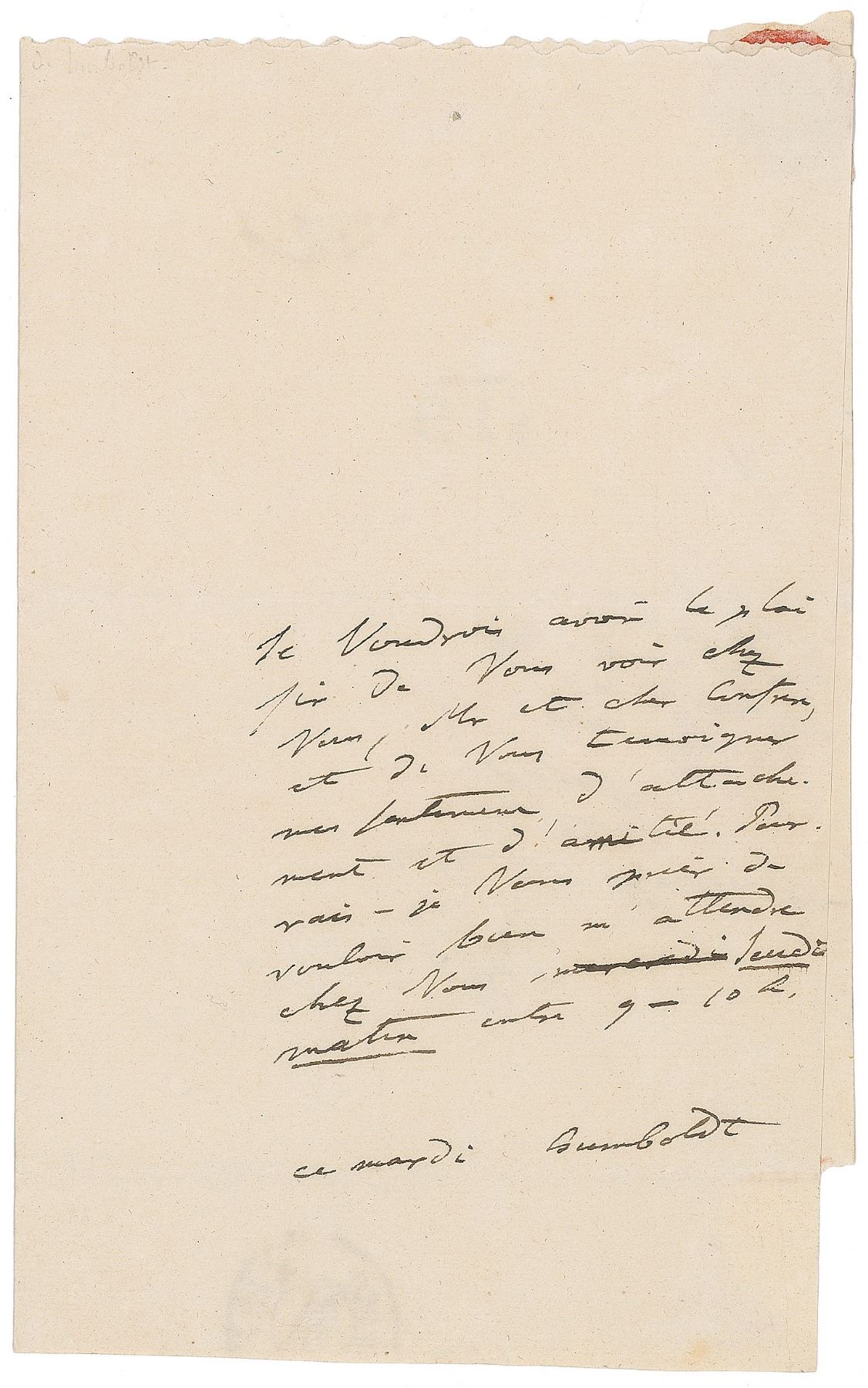 German naturalist and explorer (1769–1859) who wrote Kosmos, a massive five-volume study which attempted to unify the various branches of man's knowledge. ALS in French, signed “Humboldt,” one page, 4.5 x 7.25, no date. Untranslated letter to Louis Freycinet, a French navigator who in 1811 published the first full outline of the coast of Australia. Addressed on the reverse of the second integral page in Humboldt's hand. In fine condition, with seal-related paper loss to the integral address leaf. A desirable piece of correspondence between scientific colleagues.