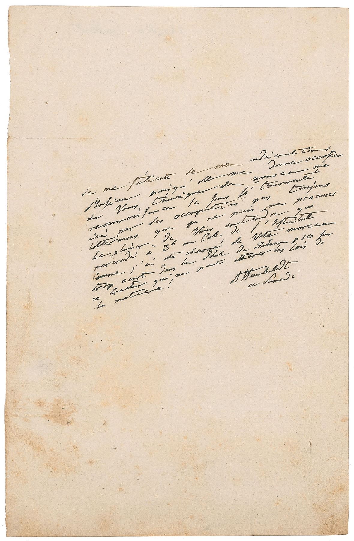 German naturalist and explorer (1769–1859) who wrote Kosmos, a massive five-volume study which attempted to unify the various branches of man's knowledge. Untranslated ALS in French, signed “A. Humboldt,” one page, 5.25 x 8, no date. In very good to fine condition, with scattered staining and soiling, and a small tear to the left edge.