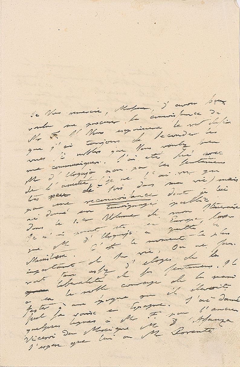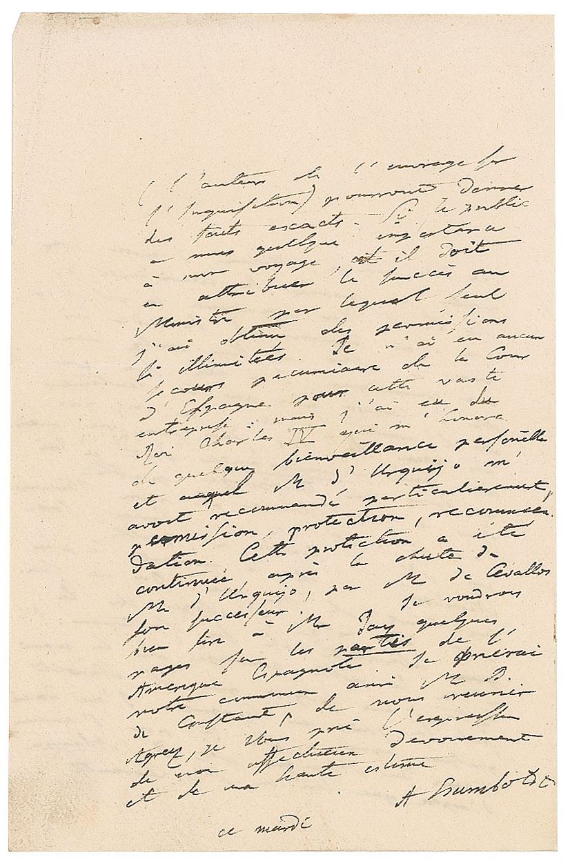 ALS in French, signed “A. Humboldt,” one page both sides, 4.5 x 7, no date. Untranslated. In fine condition, with seal-related paper loss to the integral address leaf.