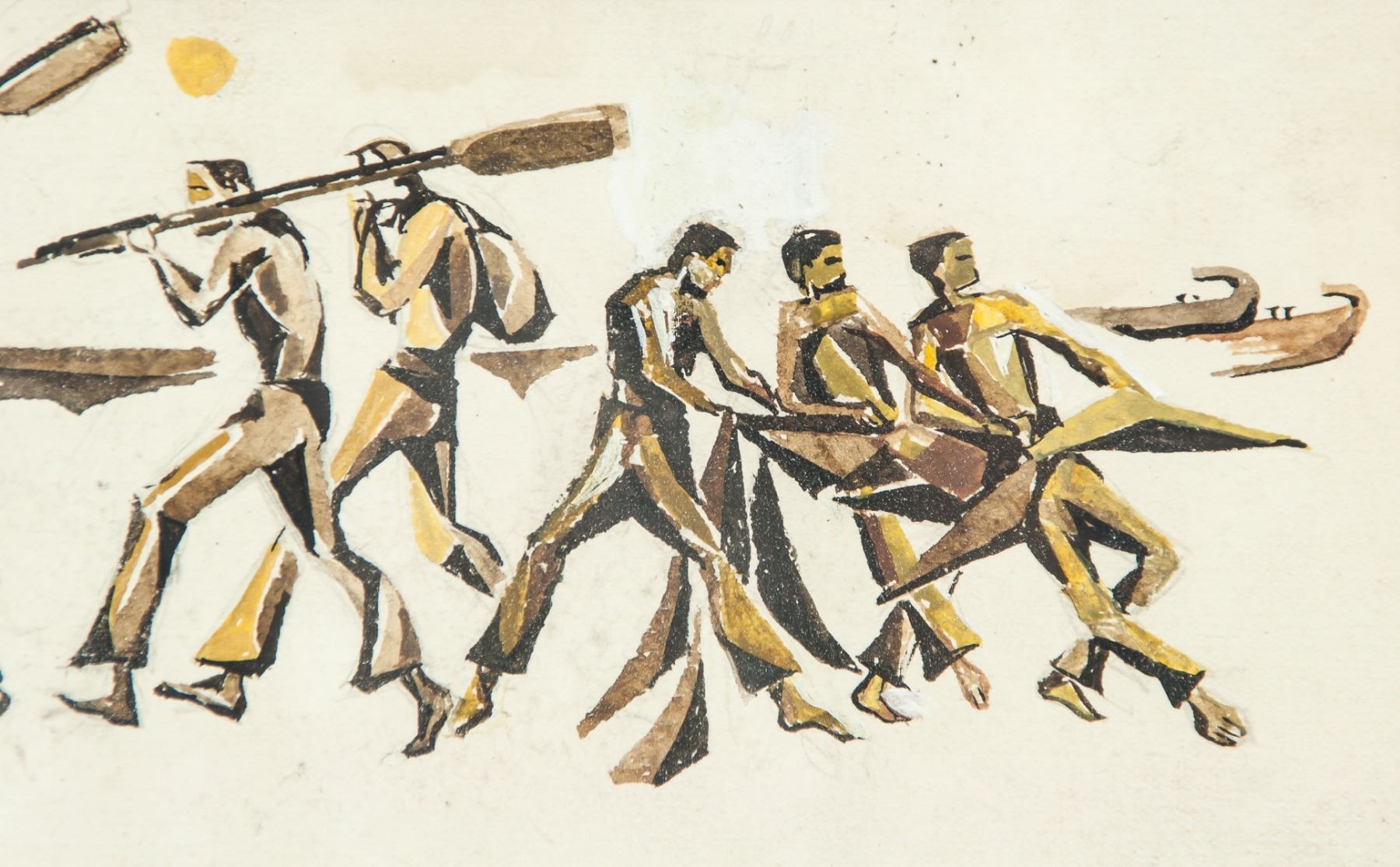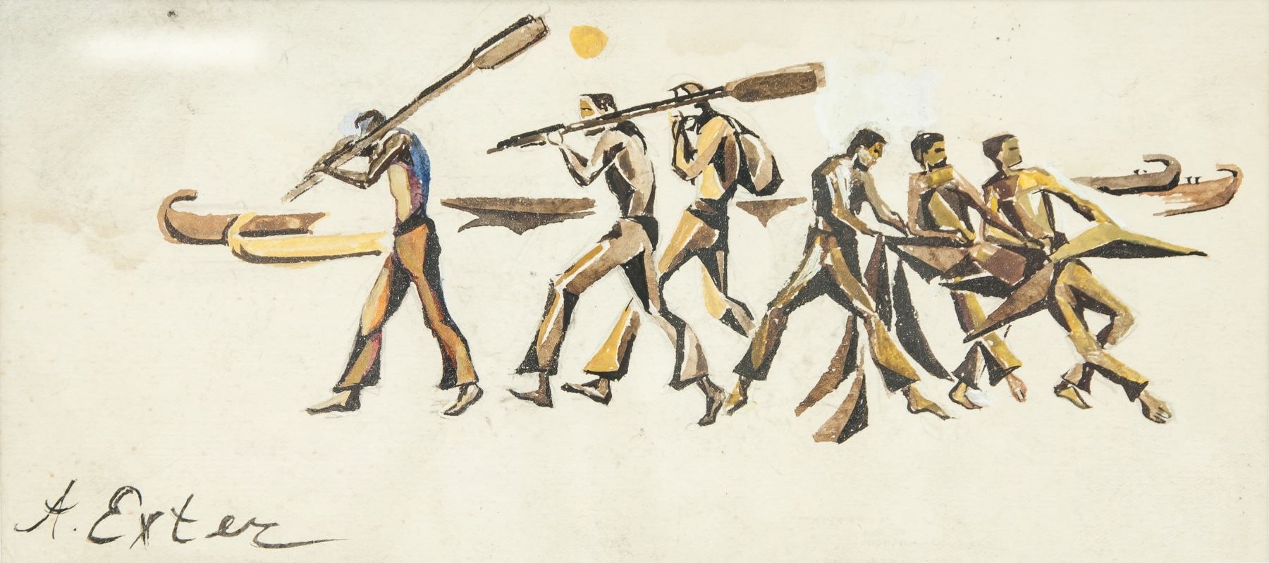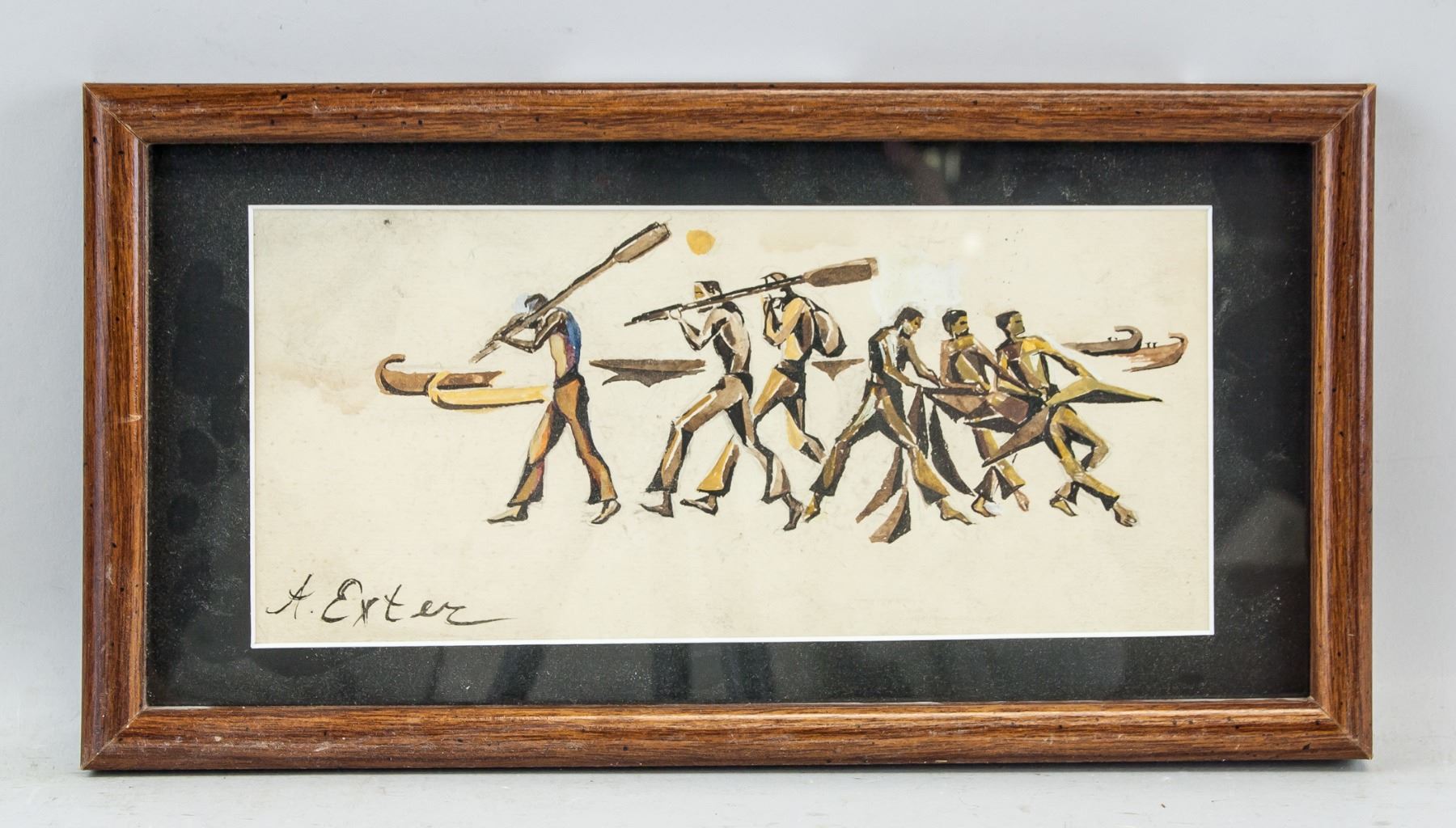 Gouache on paper, framed. Featuring figures. Signed A. Exter on the lower left corner. Attributed to Alexandra Exter (1884-1949, Ukrainian). 11 x 24 cm (4.3 x 9.4 inches), Frame: 17.5 x 32.5 cm (6.9 x 12.8 inches). PROVENANCE: Southern Ontario estate